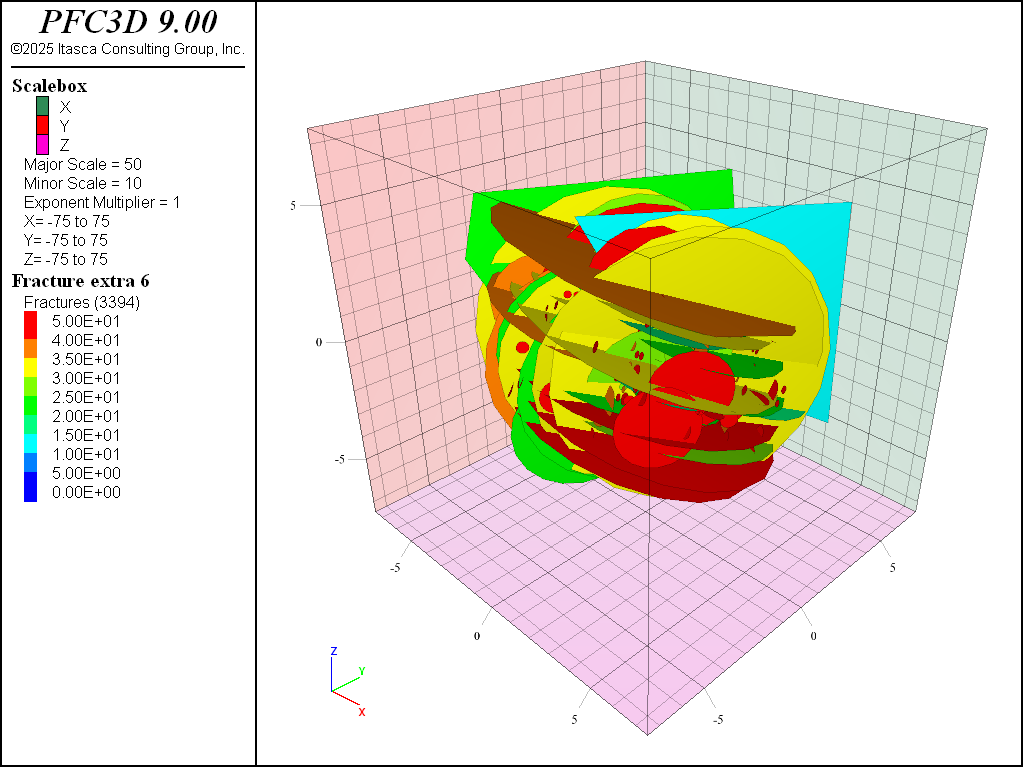 To generate trace maps and get the intercepts along a borehole, one must first calculate the intersections between the DFN and the outcrops. Intersections between fractures and plane are called traces; intersections between fractures and lines are called intercepts. With the fracture intersections compute command and the with-geometry keyword, intersections between fractures and geometries are computed and saved in different intersection sets. Then, in order to facilitate further analysis, fracture extras are assigned an index defining whether or not they intersect one of the current geometry sets with the assign_extras FISH function. We assign the values 1, 2, and 3 to extras 1, 2, and 3, in order to identify which fractures are associated with the corresponding intersection sets. The use of various extras is explained by the fact that a fracture can simultaneously intersect several different geometries. Similar FISH functions could also be used to export trace properties.