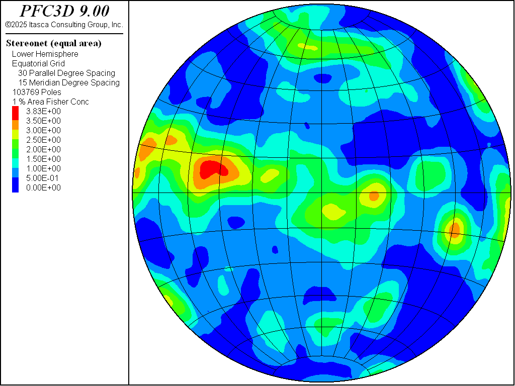 During generation, the fracture orientations are randomly selected while respecting the relative proportions of the weight column. The stereonet of the distribution used in this example is shown in Figure 1, as output by the PFC stereonet plot item.