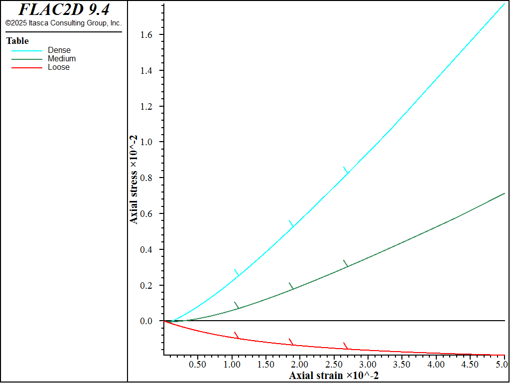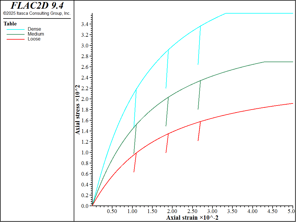 Triaxial tests on dense, medium, and loose sand are simulated using the CYSoil model. The model properties are listed in Table 1. This example does not consider yielding on the cap; therefore, flag_cap is set to 0 (default value). In this case, initial pressure, \(p_{ini}\), is required; it is used by the code to calculate for bulk and shear moduli. The dilation is constant; therefore, flag_dilation is set to 1, and a value is assigned to the dilation property. The initial stress state is isotropic, with mean pressure equal to 100 kPa. The cell pressure is kept constant during the test, the base of the model is fixed in the axial (\(y-\)) direction, and an axial velocity of 10-6 m/step is applied at the top of the model. In addition, three unloading/reloading excursions are performed.