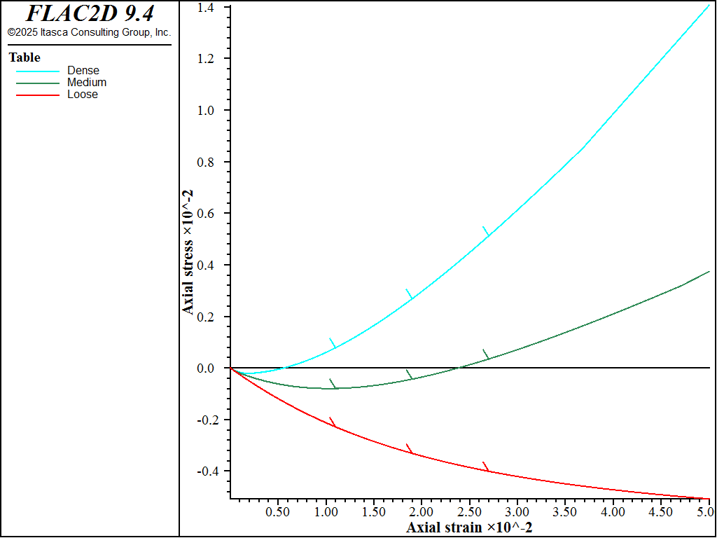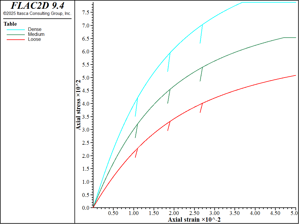 Figure 3: \(\mid \sigma_1 - \sigma_3 \mid\) (in kPa) versus axial strain for dense, medium, and loose sand—constant dilation (dilation = 100 kPa).