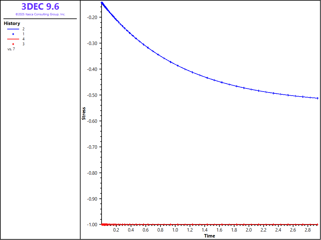 Because no value is assigned to the property viscosity-maxwell, the Maxwell dashpot is not taken into account by the models. Also, the cohesion property is set to a high value to prevent triggering of the plasticity logic for the Burgers-Mohr model. The initial state is first obtained by cycling the model to elastic equilibrium. Velocities are then reset to zero. For the viscous response, the initial timestep is set to a small value (\(\Delta t\) = 10-6) compared to the ratio of viscosity over shear modulus (\(\eta /G_K\) = 1.0). With the choice of creep timestep parameter settings used in the example, the timestep increases by a factor of 1.01 when the out-of-balance force ratio is less than 10-4, until \(\Delta t\) = 0.1. At the end of the simulation, the response is for two shear moduli, \(G_{k}\) and \(G\), acting in series (long-term behavior). Figure 1 and Figure 2 show the agreement between analytical solutions and numerical predictions for stresses and strains in the two samples.