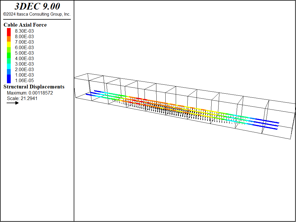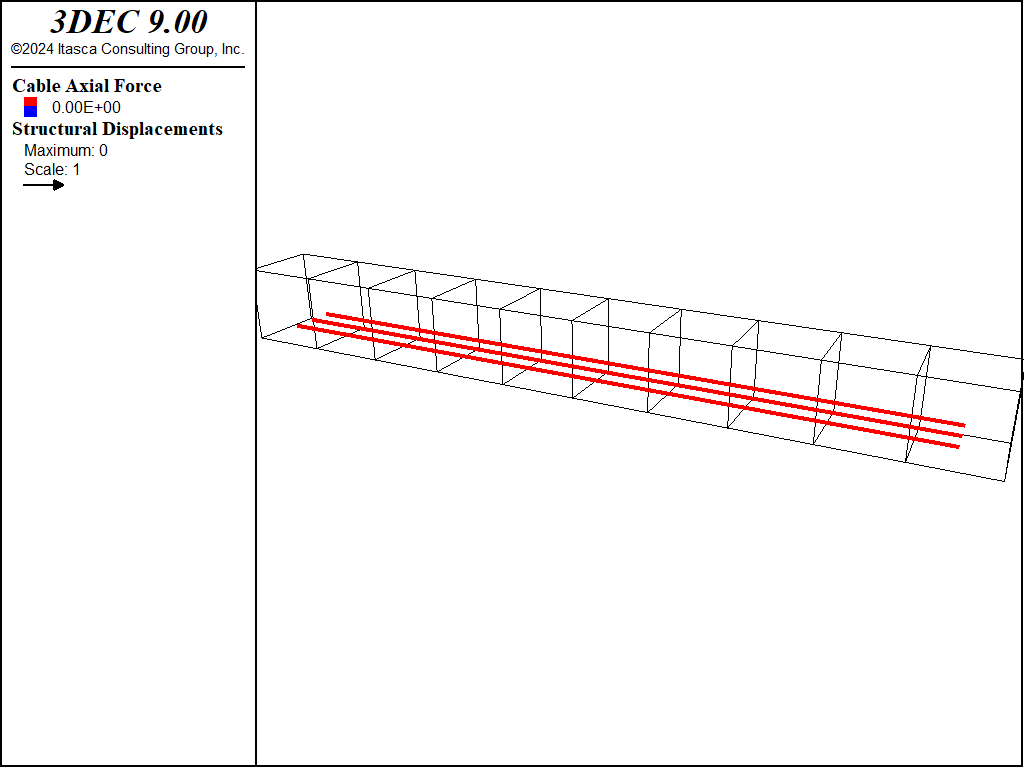The beam is 10x10x100 cm and a zone size of 5 mm is used. The 3DEC model is shown in Figure 1. Three cables are installed inside the beam, close to the bottom as shown in Figure 2. The ends of each cable are rigidly attached to the grid.