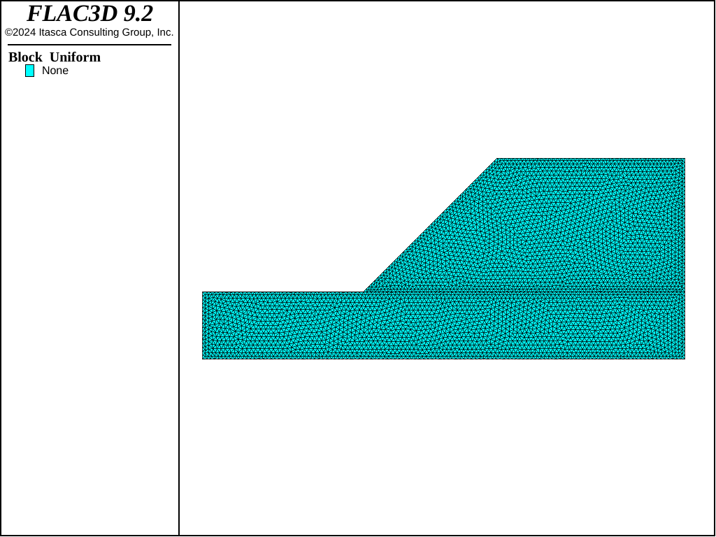 The 3DEC model mesh used for this test is shown in Figure 1 below. The model contains a horizontal construction joint at the toe of the slope to assist in zoning. The maximum zone width is set to 0.3 m.