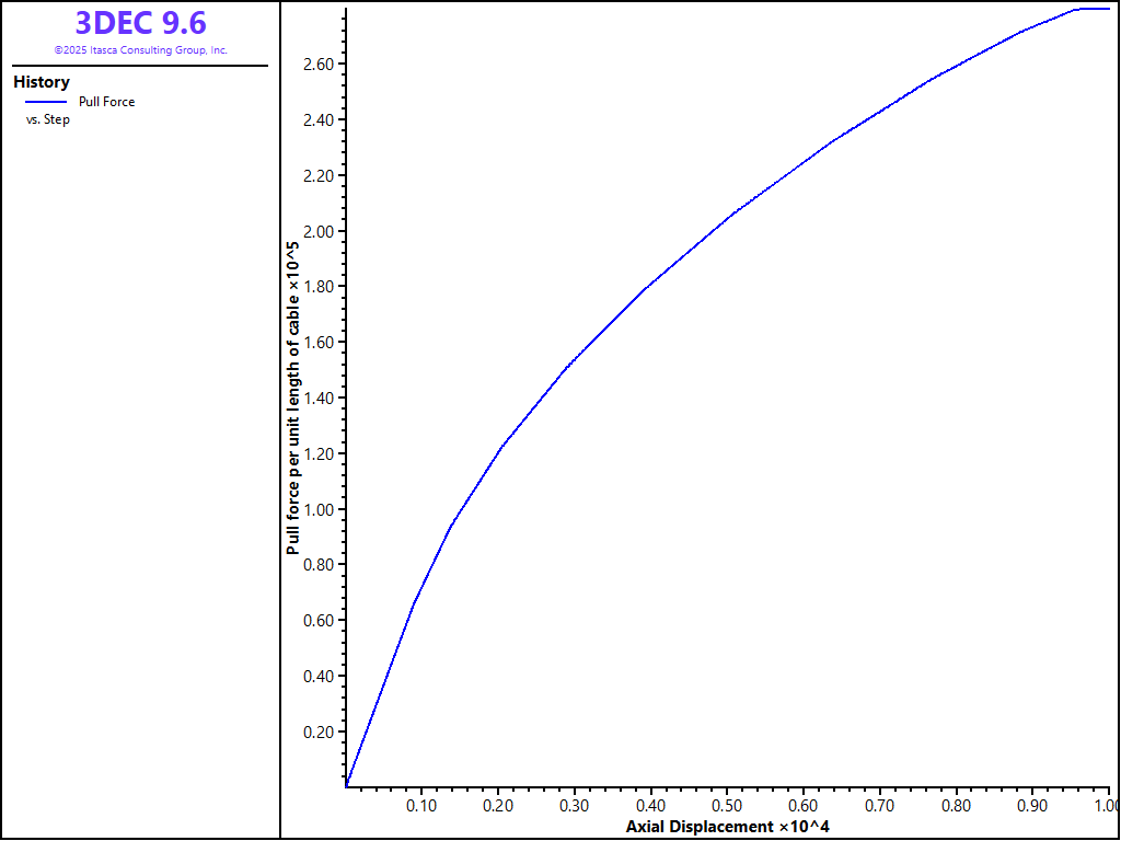 The cable shear bond strength will, in general, increase with increasing effective pressure acting on the cable. In the above model that does not occur because the frictional strength of the grout was set to 0. To test the dependency on confining stress, the same model is run but a non-zero grout friction and perimeter are assigned. The friction angle of the grout is set to 30◦. The perimeter is set assuming the hole diameter is twice the cable diameter. Inline FISH is used to perform the calculation. The result of this test is shown in Figure 3. You can see that this bolt is indeed stronger than the bolt with zero frictional grout strength.