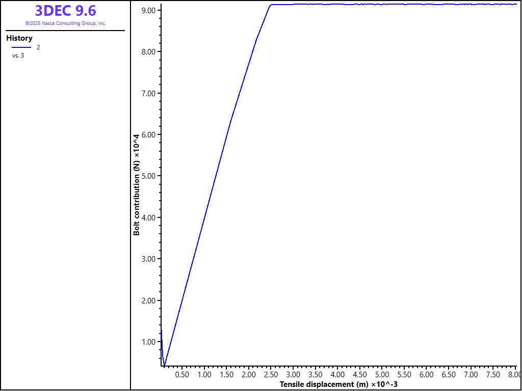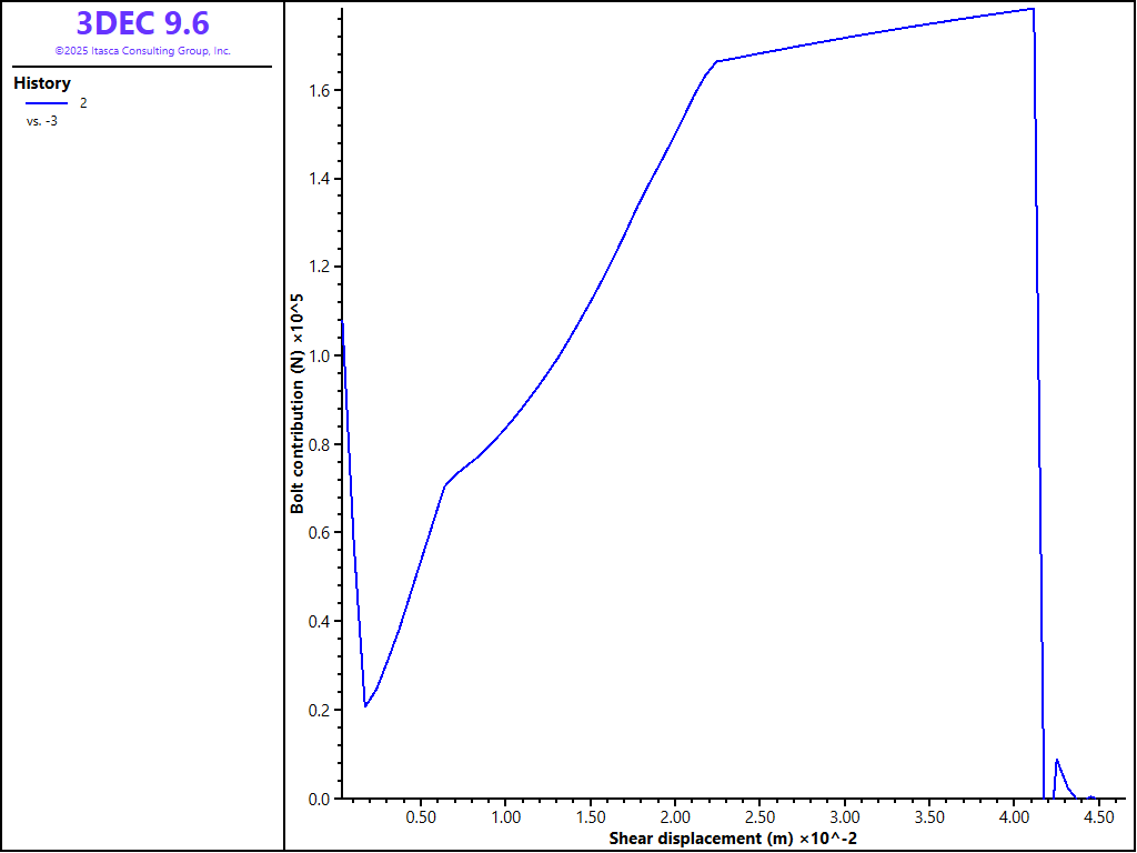 Figure 3 shows the block and cable configuration at the end of the test. Figure 4 shows the bolt contribution in this test. Since there is no tensile strength on the joint, the bolt contribution is simply equal to the tensile force applied at the right boundary. This plot shows the initial elastic axial deformation, and then the start of grout failure at around 2 mm of displacement. Finally, the cable yields in tension after 3 mm of pull, at which time the bolt behaves plastically and the contribution no longer increases.
