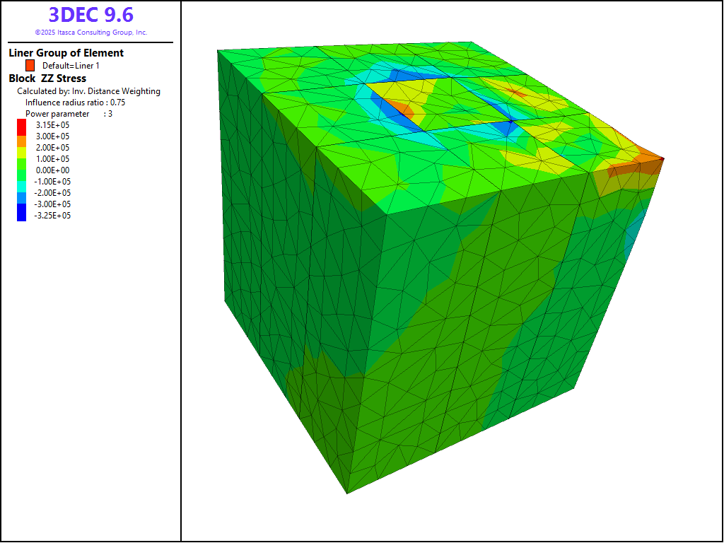 The 3DEC model is a one cubic meter block of soil with a 0.33 m2 concrete liner composed of xx liner elements centered on top of the soil block, as shown in Figure 1. The soil is assigned elastic properties (\(E\) = 15 MPa, \(\nu\) = 0.3). The liner material is assigned properties corresponding with a concrete liner 0.1 m thick (\(E\) = 25 GPa, \(\nu\) = 0.15, \(t\) = 0.1 m), and the following liner-zone interface properties are assigned: