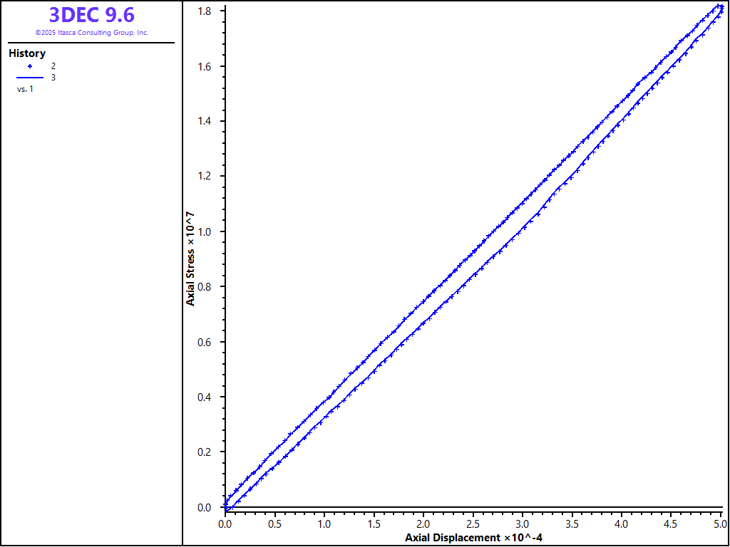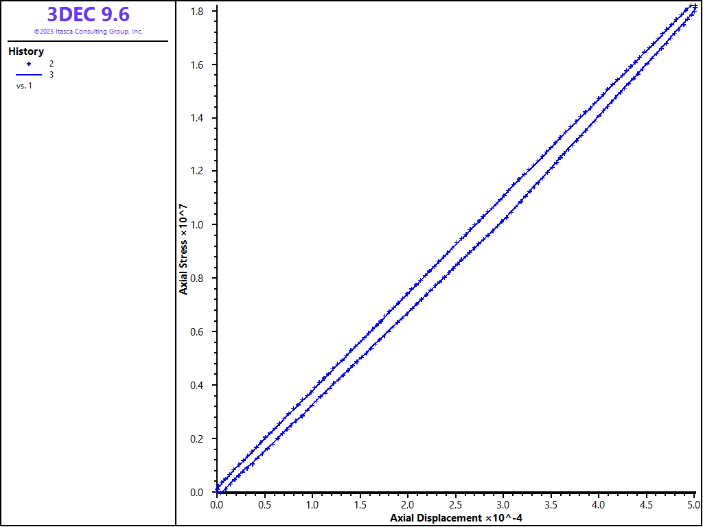 Vertical stress versus vertical displacement curves (obtained using the analytic solution and calculated by 3DEC) are shown in Figure 5 and Figure 6. Figure 5 compares the analytic solution with the results obtained by 3DEC for plane-strain conditions; Figure 6 compares the analytic solution with the results obtained by 3DEC for plane-stress conditions. (A FISH function was used to calculate the average displacements and average stress at the top of the model. The analytical results were also calculated using a FISH function.)