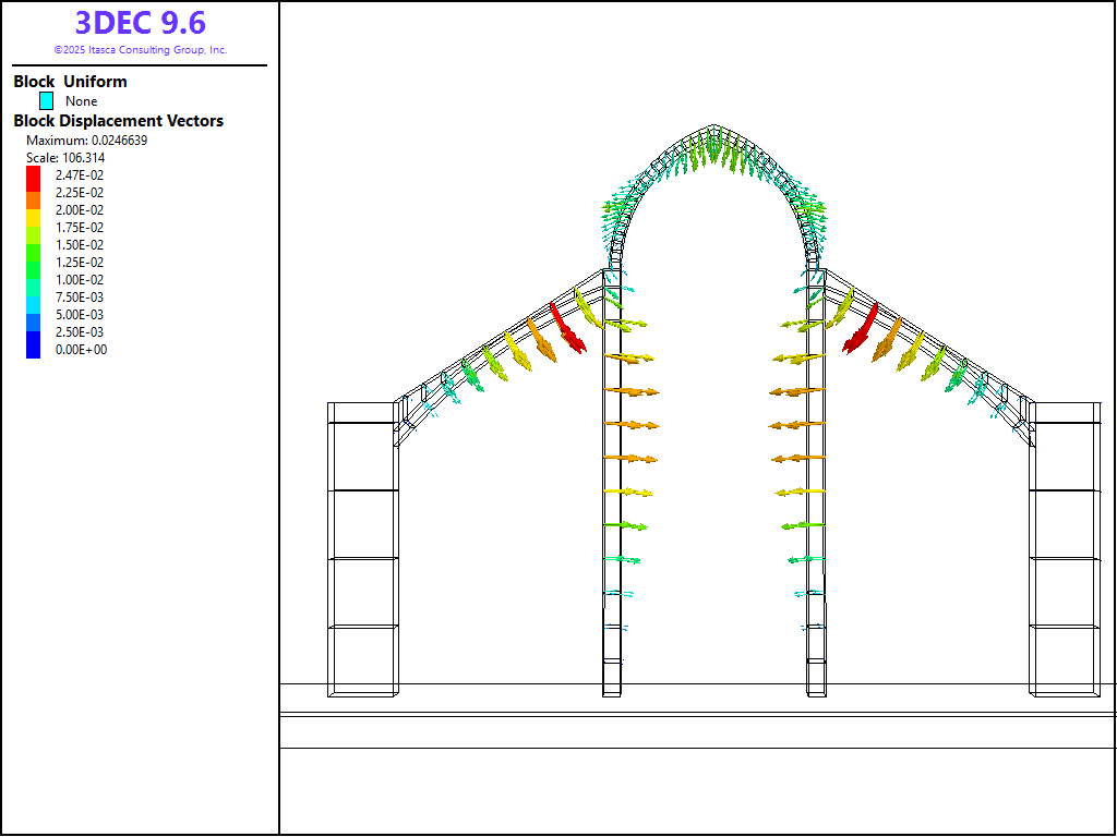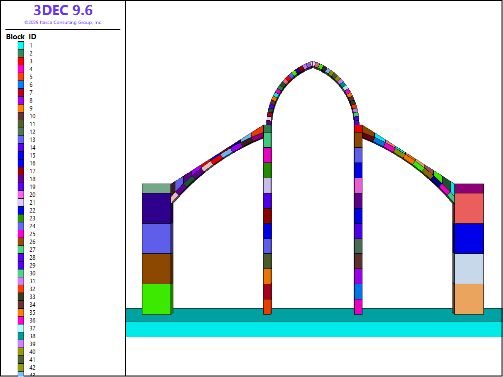 A 3DEC model of one set of buttresses is constructed. The buttresses are modelled as 1 m thick blocks (approximately equal to the true thickness). The gothic arch at the top is also modelled as a set of blocks 1 m thick. In reality, the vault is continuous in the out-of-plane direction. Therefore, in order to account for the total weight of the arch acting on the buttresses its weight (density) is multiplied by 6 m, the bay spacing, so that the correct outward push is applied to the pillars. The span of the arch is approximately 11 m and the height is 34 m. The 3DEC model shown in Figure 3 and obviously represents a simplified geometry (compare to Figure 1 and Figure 2).