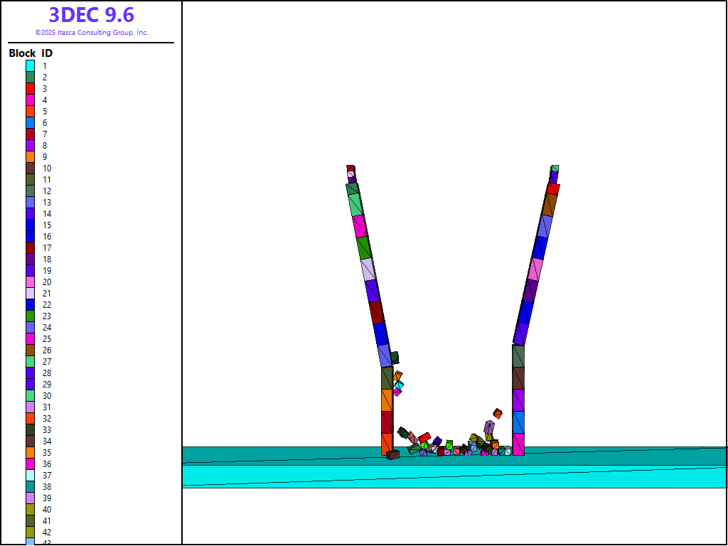The model is configured to be dynamic to ensure accurate calculate of moments of inertia for the blocks. However, since only a static solution is required, the dynamic calculation is set to off (high damping will be present). Gravity is turned on and the model with buttresses is solved to equilibrium. Displacements are shown in Figure 4. The same model is then run without buttresses. The model is stopped after 20,000 steps due to obvious collapse. The evolution of failure is shown in Figure 5.