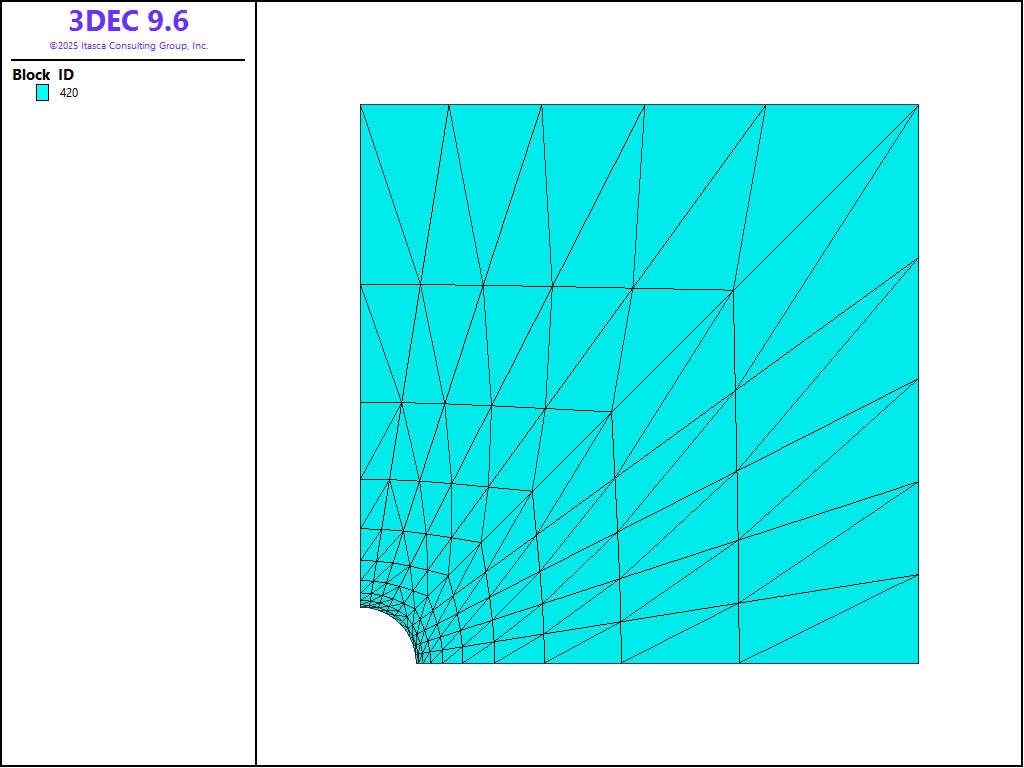 The geometry of the 3DEC model used for this analysis is shown in Figure 2. The model is constrained in the direction of the \(x\)-axis, so that it can only move in the \(yz\)-plane (plane-strain condition). The model consists of 100 joined blocks in a radial pattern. The boundary was selected at 10 m (i.e., five hole-diameters) from the hole center. The problem was solved using three different zoning types. In the first case, a mixed-discretization (hex) zoning was used to discretize 100 blocks into 1000 zones. Figure 3 shows the geometry of blocks and zones for this case. (There is one hex zone – i.e., two sets of 5 overlapping tetrahedra per block.) In the second case, 100 blocks were discretized into 5689 “regular” tetrahedral zones. The geometry of the zones on one side of the model is shown in Figure 4. In the third case, the 100 blocks were discretized into 5689 high-order zones. In all cases, the blocks were joined (i.e., the discontinuities between blocks have no effect on deformation of the model).