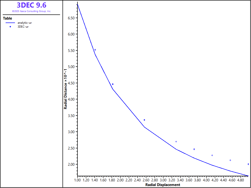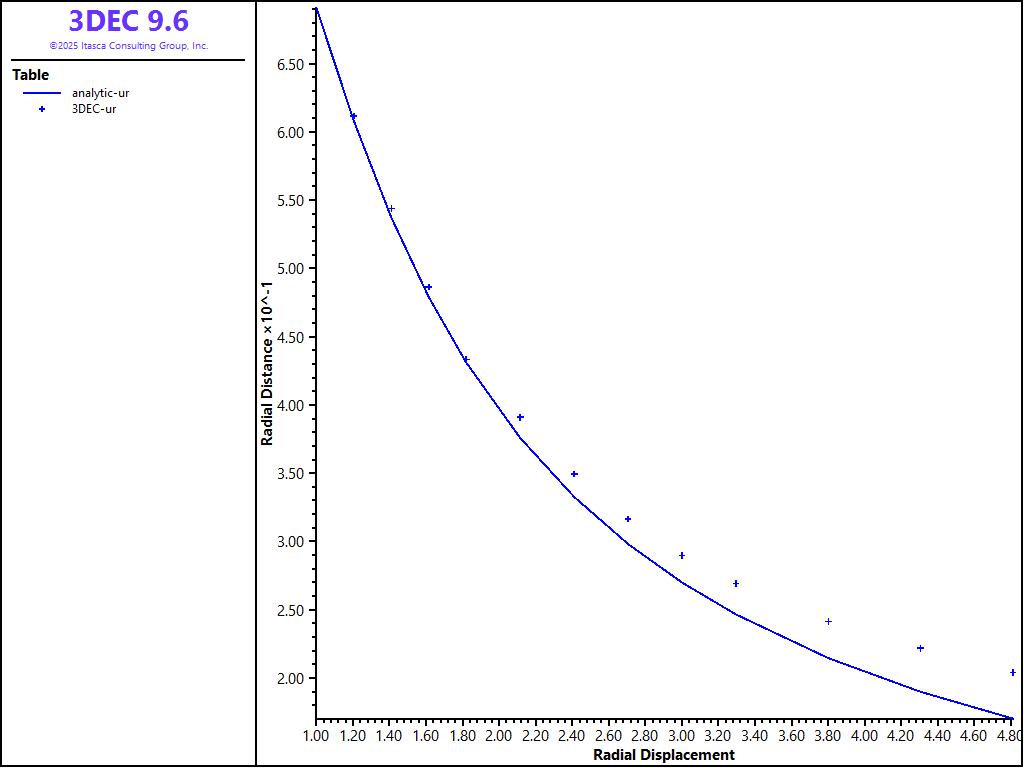 Vertical displacements along the \(y\)-axis are extracted from three 3DEC models and compared with analytical solutions. The comparison is shown in Figure 6, Figure 7, and Figure 8. Numerical results obtained with two different zonings of the model show excellent agreement with the analytical results, up to a distance of 2.5 radii from the center of the opening. The error at larger distances from the center of the opening is a consequence of the finite size of the models and the approximate boundary conditions.
