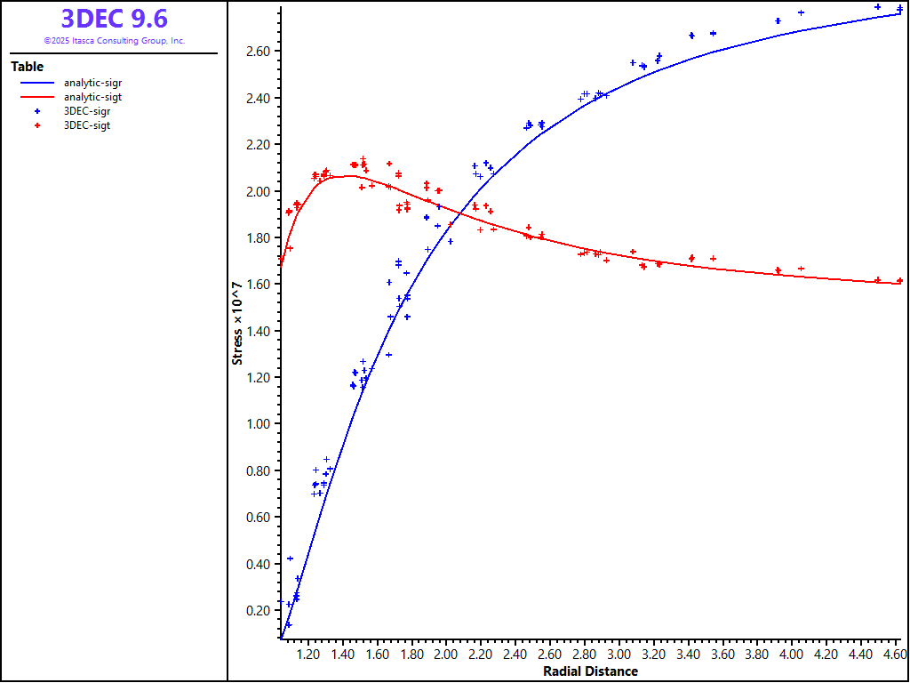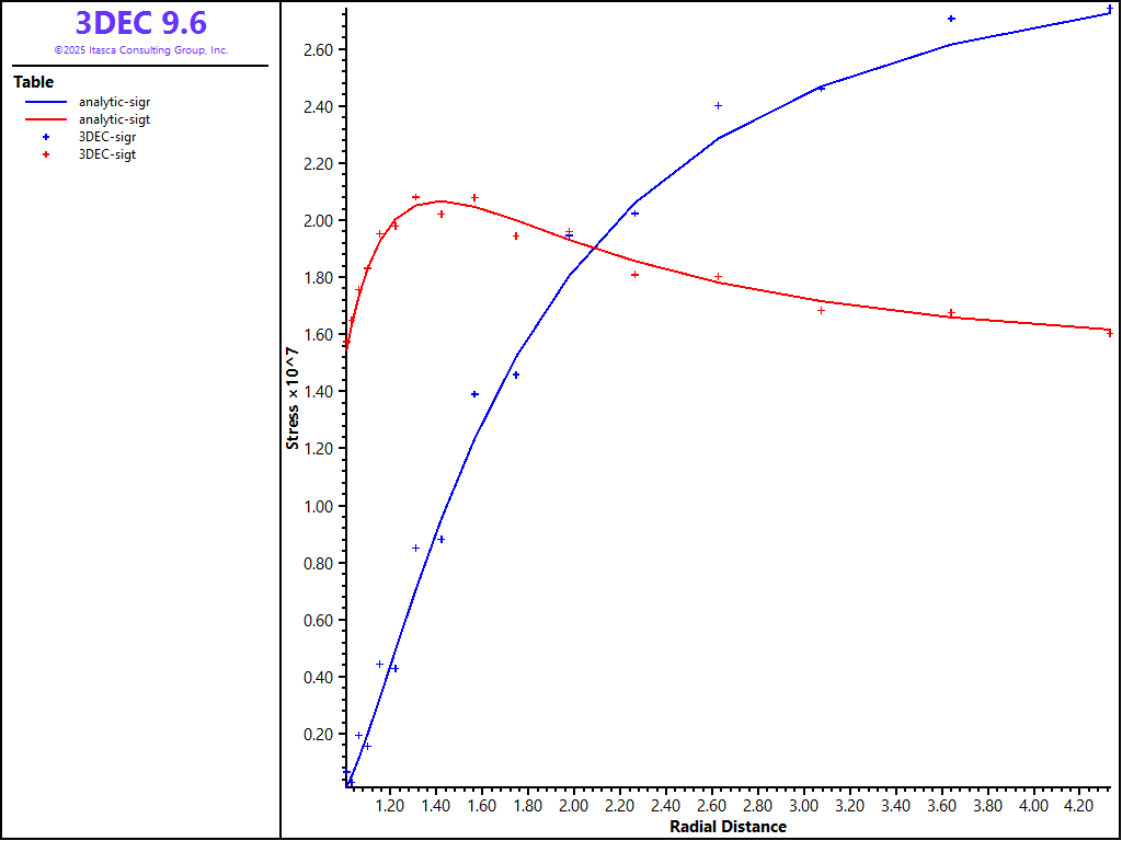 in which \(u_r\) is the radial outward displacement, \(u_\theta\) is the tangential displacement (as shown in Figure 1), and \(\nu\) is the Poisson’s ratio. The analytical solutions for both the stresses and the displacements are implemented in FISH functions listed in “ElasticHole.fis”.)