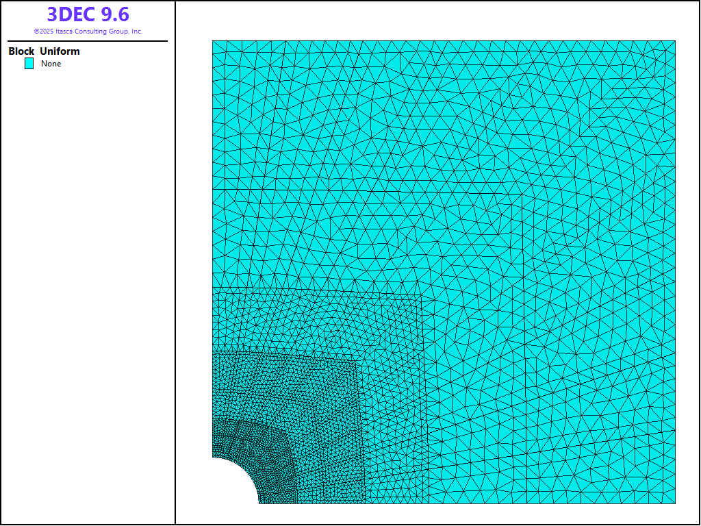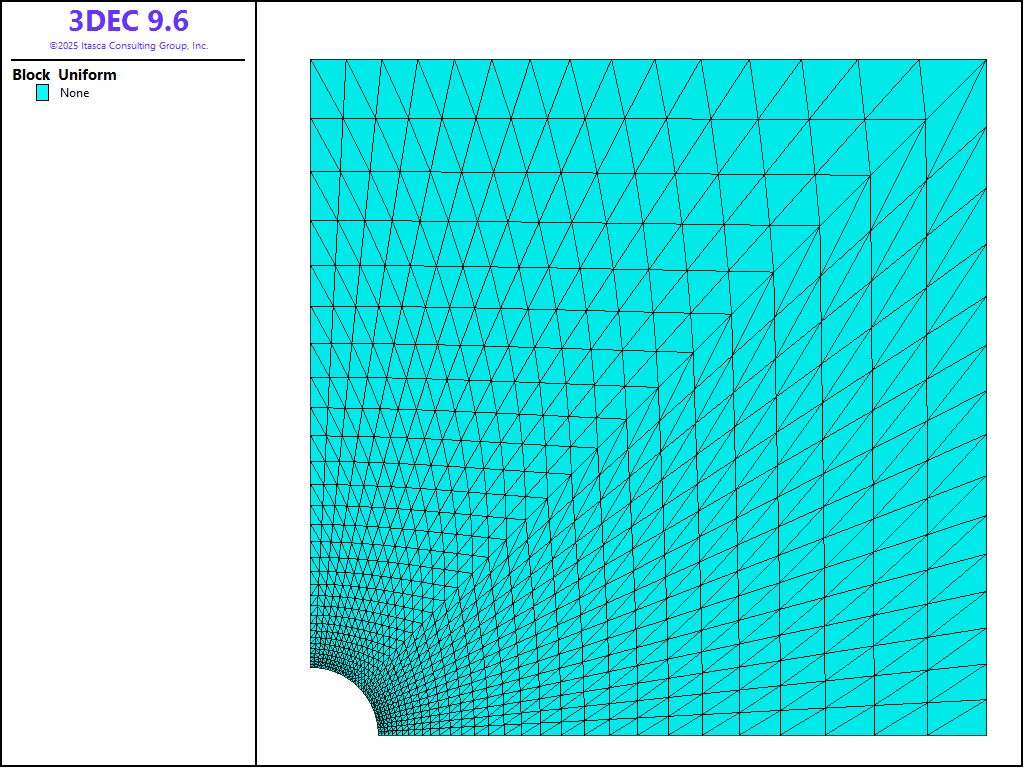 Figure 2: 3DEC model geometry used for analysis of cylindrical hole in a Mohr-Coulomb medium.