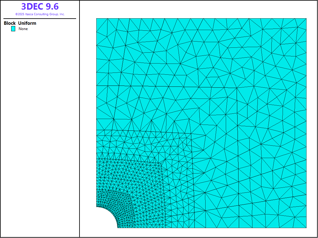 The geometry of the 3DEC model used for this analysis is shown in Figure 2. The model is constrained in the direction of the \(x\)-axis, so that it can only move in the \(yz\)-plane (plane-strain condition). The model consists of 900 joined blocks in a radial pattern. The boundary was selected at 10 m (i.e., five hole-diameters) from the hole center. The problem was solved using three different types of zoning. In the first case, a mixed-discretization (hex) zoning was used to discretize 900 blocks into 9000 zones. (An accurate solution of elasto-plastic problems requires finer zoning than is needed for the simulation of linearly elastic problems.) Figure 3 shows the geometry of blocks and zones for this case. (There is one hex zone — i.e., two sets of 5 overlapping tetrahedra per block.) In the second case, 900 blocks were discretized into 50,900 “regular” tetrahedral zones. The geometry of the zones on one side of the model is shown in Figure 4. In all cases, the blocks were joined (i.e., the discontinuities between blocks have no effect on deformation of the model). In the third case, 900 blocks were discretized into 1096 higher-order zones. The geometry of the zones on one side of the model is shown in Figure 5.