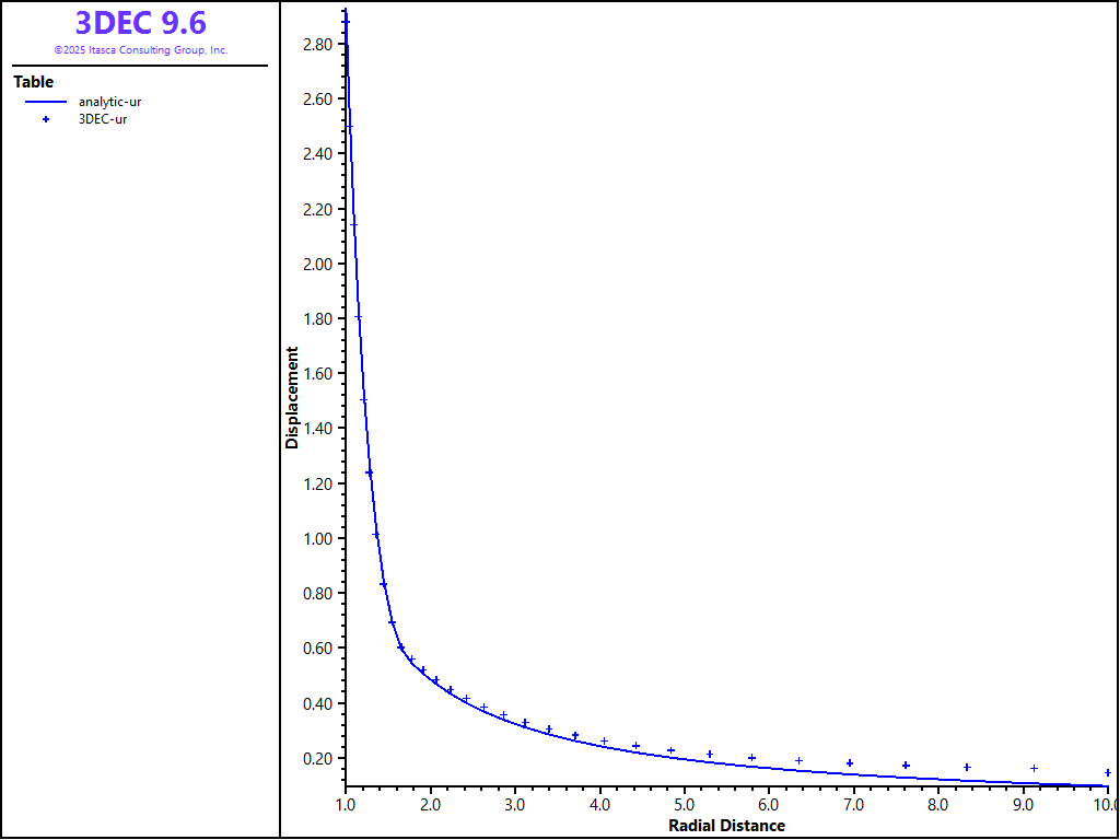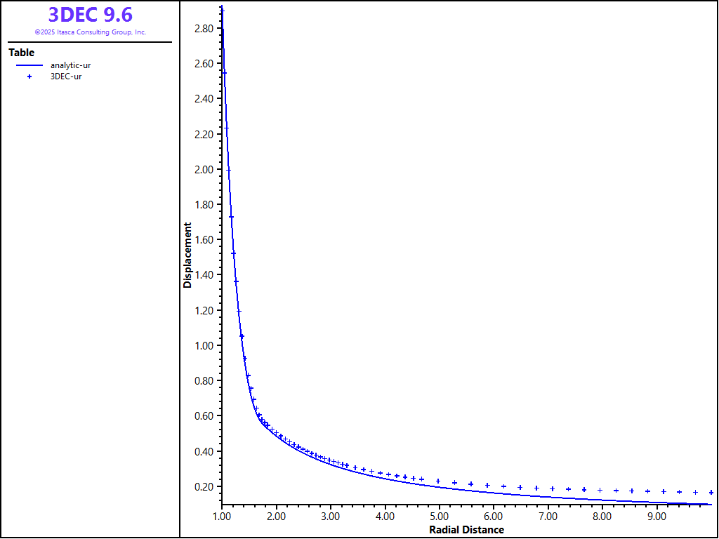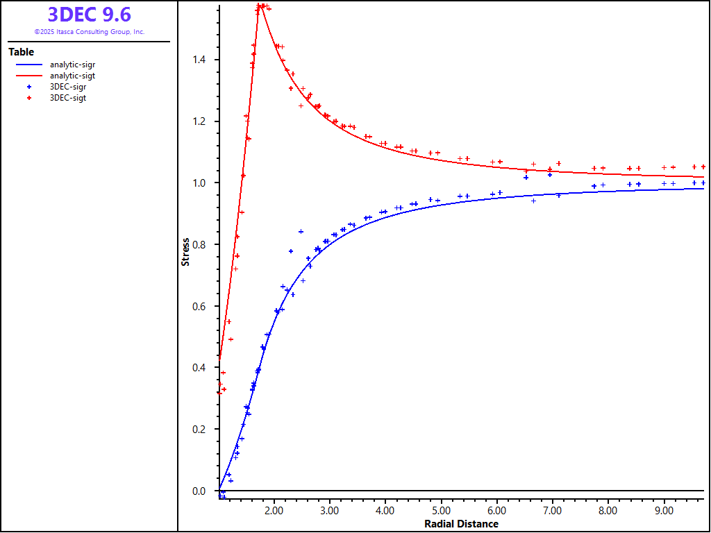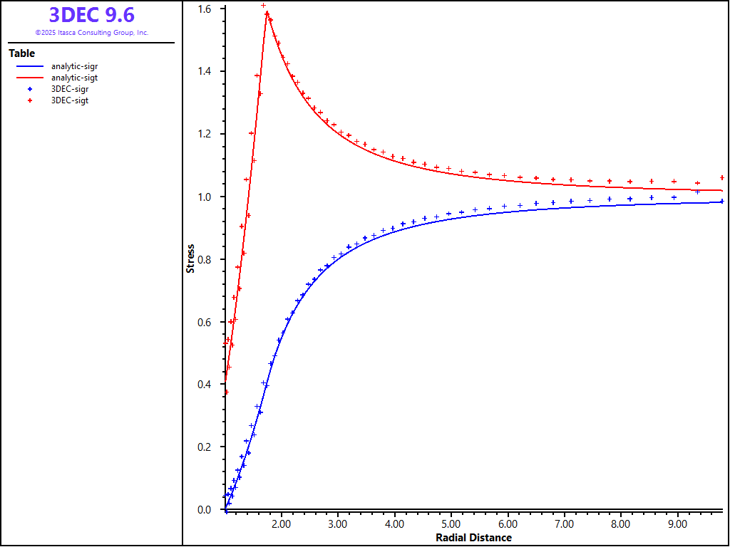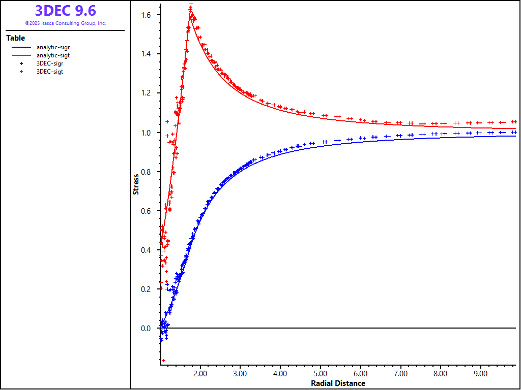 Because the problem is axisymmetric, all results are presented as a function of the distance from the center of the opening. Figures 6 and 7 compare 3DEC results using hex zoning with the analytical solution. (The radial displacements are compared in Figure 6; the radial and tangential stresses are compared in Figure 7.) The plots show excellent agreement between the two results. Note the 3DEC stresses plotted in Figure 7 are not tetrahedral zone stresses, but stresses obtained by averaging the tetrahedral stresses on the level of the hex zones. (Even in the case of hex zoning, stresses in 3DEC are stored in tetrahedral zones. Quad-zone stresses (i.e., average stresses on the level of a hex zone) are calculated during the calculation of velocities and stress increments only.) A FISH function was used to calculate the average stresses (see “mchole.fis”) .