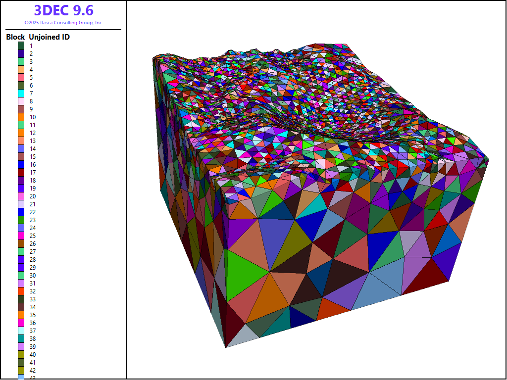 A 3DEC model is first created from the data file nomerge.dat. A griddle mesh is imported, and the blocks prior to joining are shown in Figure 1.