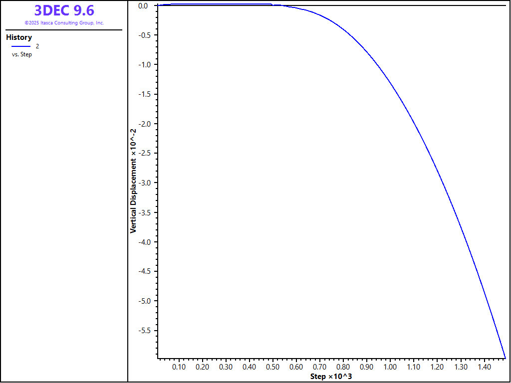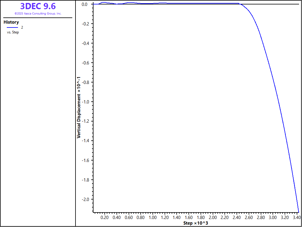 Figure 6: 3DEC history plot of vertical displacement of the pit crest — rigid blocks.