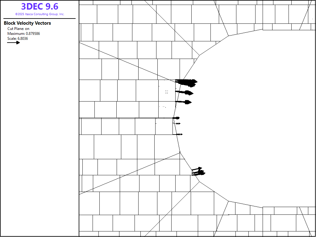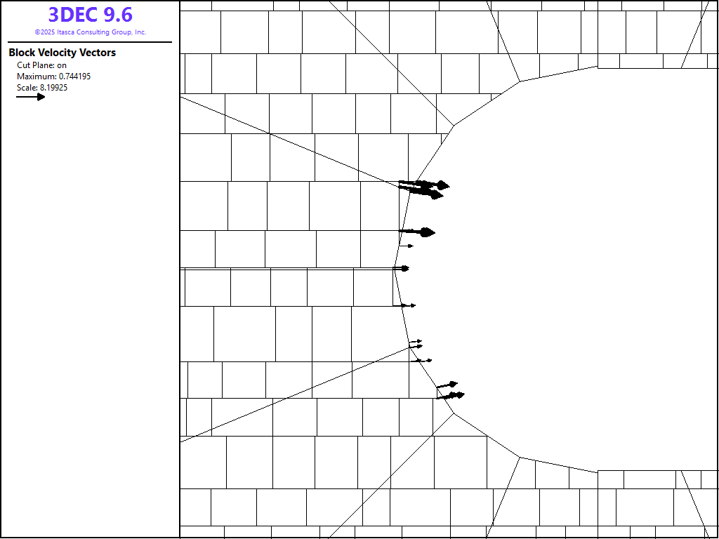 Figure 3: 3DEC plot of velocity vectors on a vertical cross-section through the pit — deformable blocks.