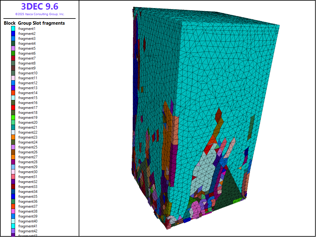 The resulting fragments are shown in Figure 5. A fragment is defined as a collection of blocks connected together by intact bonds (joints that have not failed in tension or shear). Separate fragments are separated by joints with broken bonds. The fragments suggest an axial splitting type mechanism, which is commonly observed in UCS tests in brittle rock.