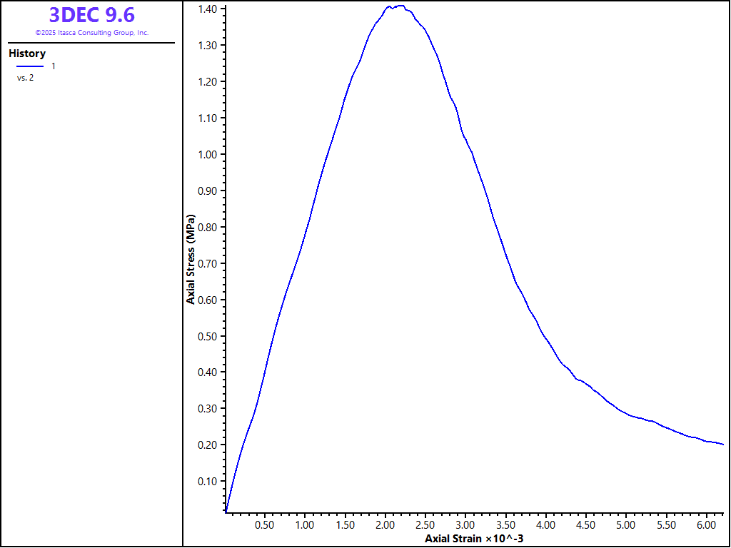 The 3DEC simulation yields a stress-strain curve as shown in Figure 4. The sample behaves in a fairly brittle manner as expected with a peak strength of 3.2 MPa.