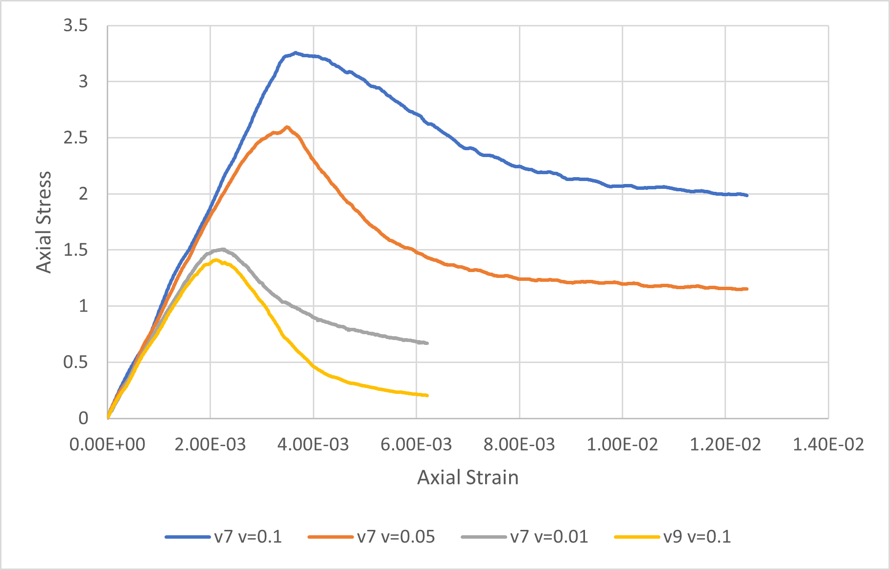 These two factors together mean that the system responds more quickly to boundary conditions. In version 7, the system was slower to respond, so a much lower rate of loading should have been used to get accurate results. In version 9, the rate of loading used in this example is sufficiently slow that the system has time to adjust and form cracks, causing a lower peak stress.