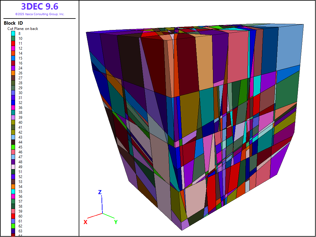 A joint-set ID of 99 is assigned to these joints since they are fictitious and you probably want to be able to identify them and give them different properties from the actual joints created with the DFN. The DFN is simulated in 3DEC in the following way: