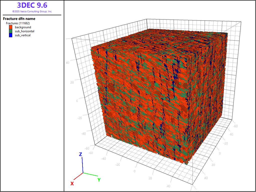 The procedure described above is performed with a single command for each DFN. In this example we will only make cuts corresponding to the subhorizontal and subvertical fracture sets. The background fractures are still too dense for 3DEC to be able to create usable convex blocks. The background fractures can be simplified further if required, or they could be accounted for by lowering the stiffness and strength of the blocks according to some classification scheme (e.g., Geological Strength Index).