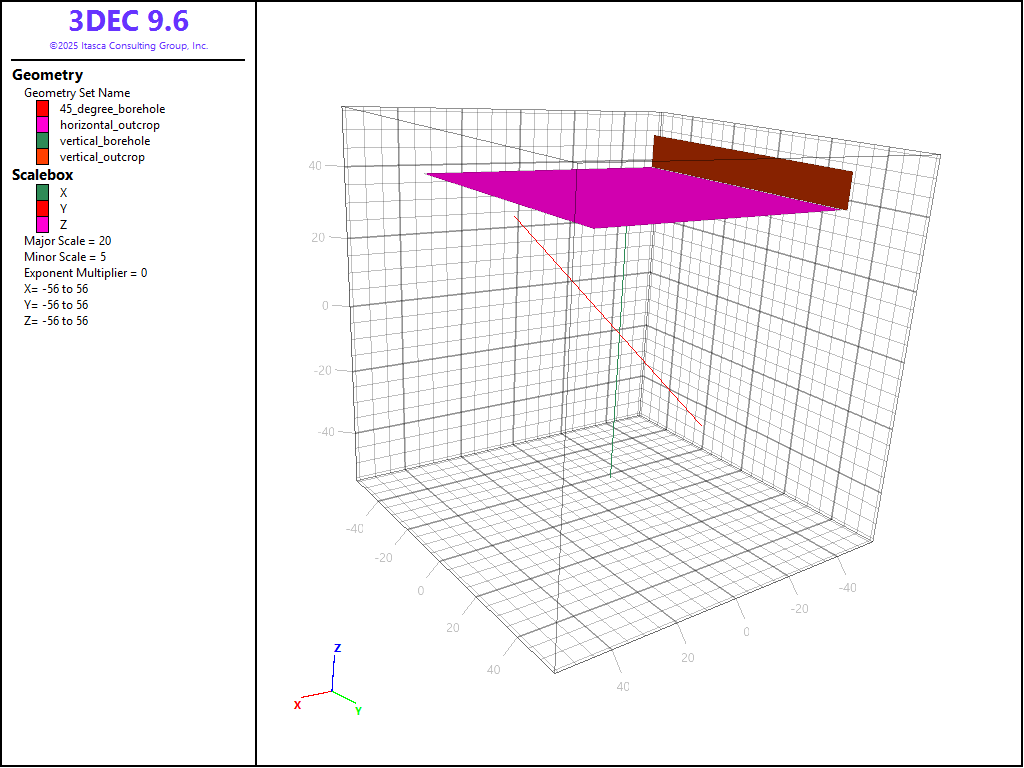 For visualization and calibration purposes, several geometry objects are defined to mimic outcrops and boreholes. It is possible to compute the intersections between fractures and 1D or 2D geometries, and analyze/visualize these intersections. Two boreholes (one vertical and one dipping 45°) plus two outcrops are defined. Outcrops are composed of a single planar (2D) polygon; boreholes are defined as 1D lines. Note that it is also possible to model boreholes by cylindrical geometries: