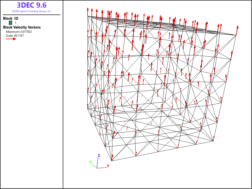 The fixed \(z\)-velocity boundary condition along the bottom boundary of the model is removed along the bottom edges of the block when the stress boundaries are applied. These points move downward, as indicated by the velocity vector plot in the figure above, when the model is loaded.