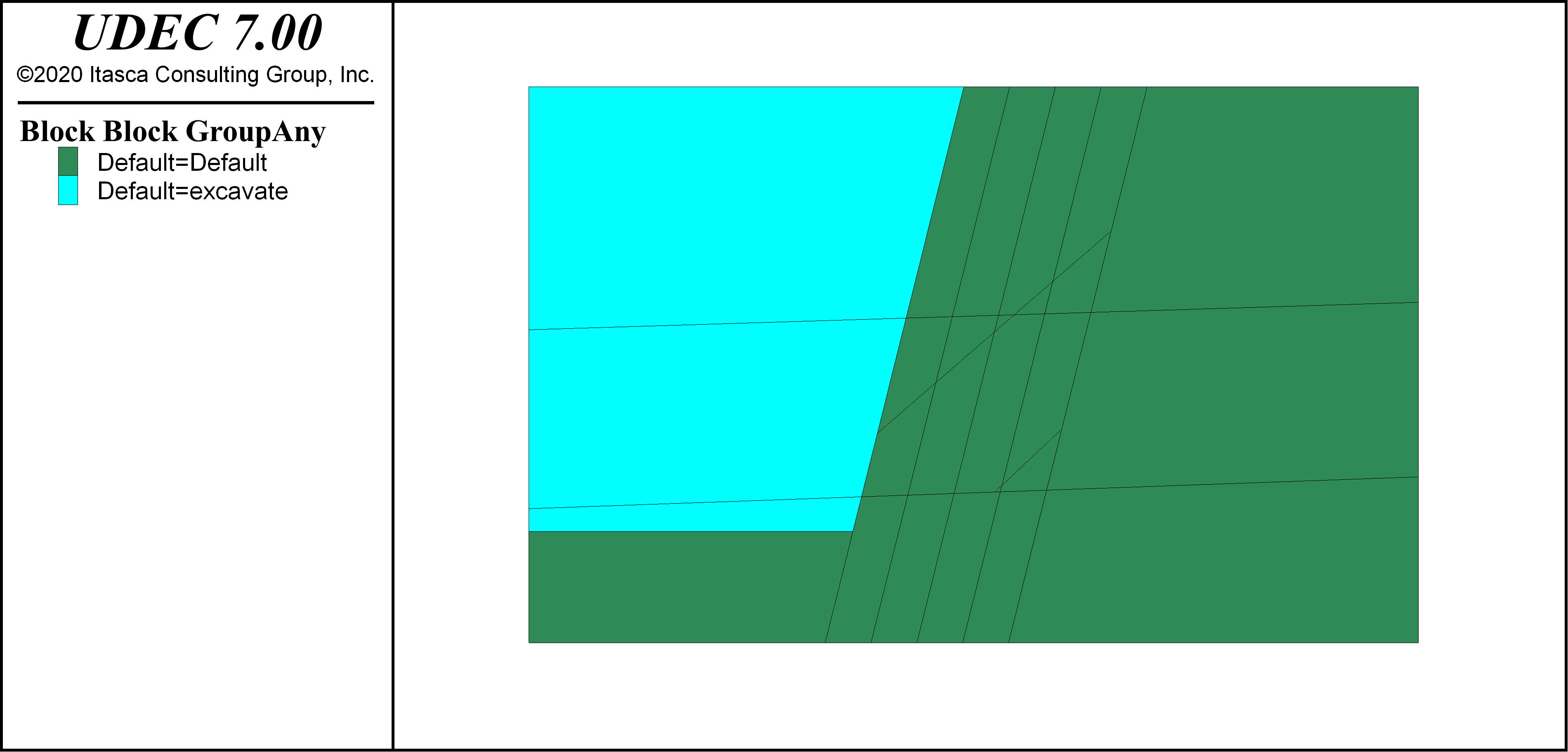 The resulting UDEC model from the simple wedge example is shown in Figure 4. This model can be run in the demonstration version of UDEC.
