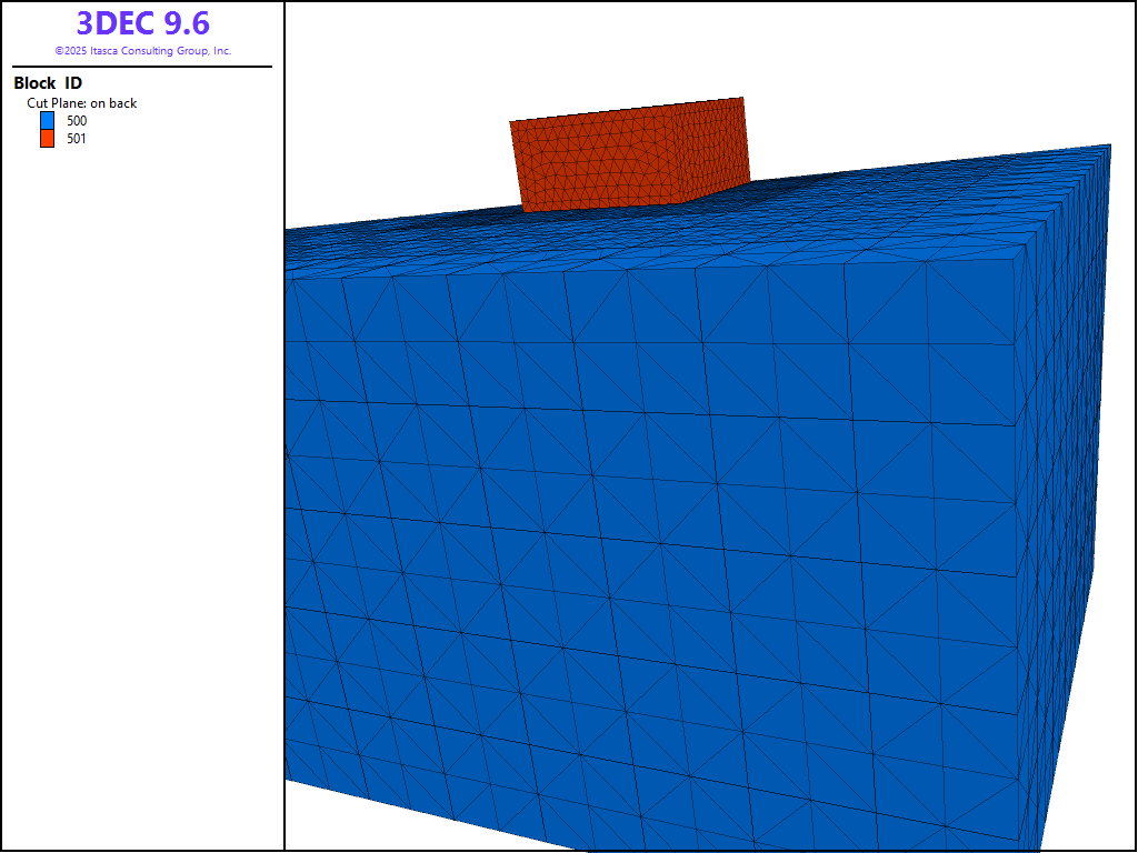 The block zone size command is used to specify the ‘local’ zone size. We can specify the zone size for different parts in the model. Note that unlike the edgelength command, if the block zone size command is given multiple times for the same range, then the last one wins. This is consistent with how all of the other 3DEC commands work. Note also that the gridpoints (and faces) will match across joint boundaries as shown in the figure below.