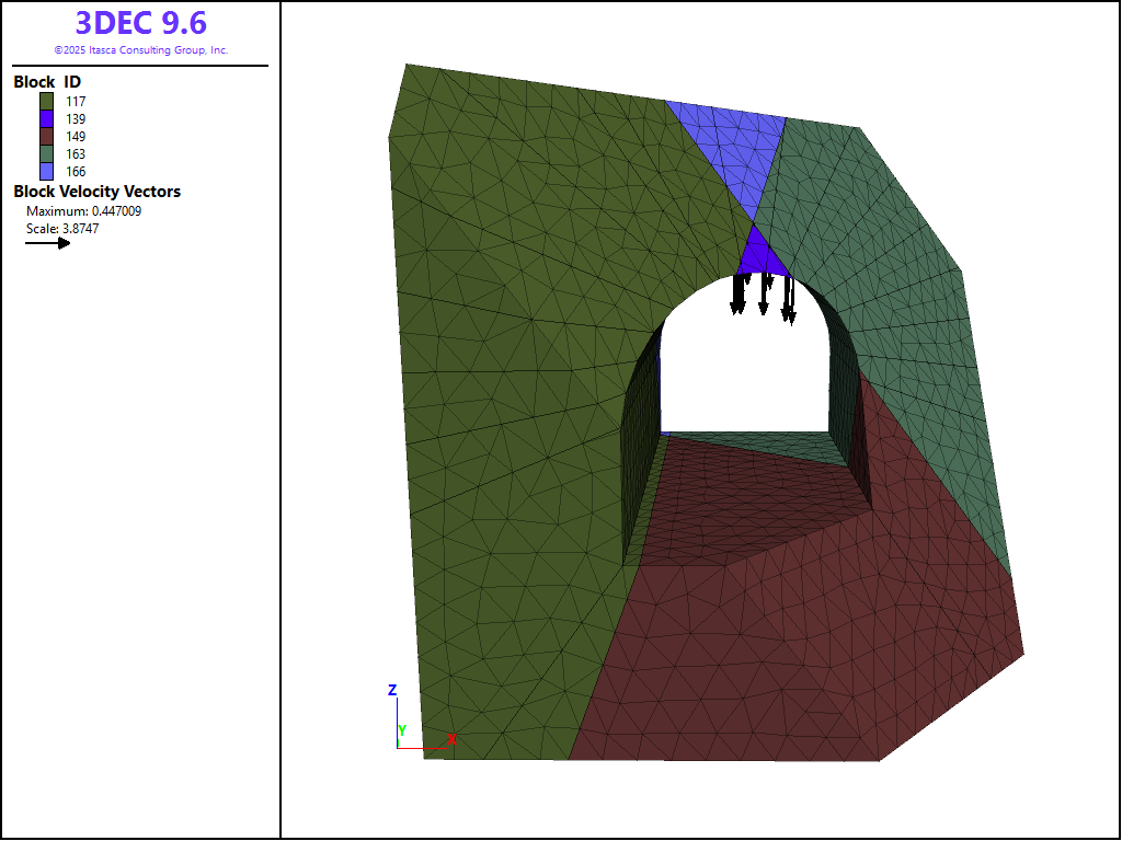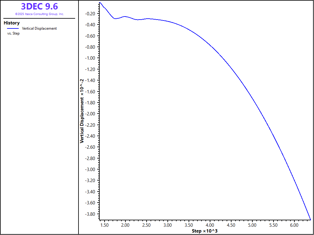 The z-displacement at a location in the roof is monitored while the model is cycled. Figure 3 plots the z-displacement history and indicates that the position is moving downward. Figure 4 shows a close-up view of the detached wedge, with surrounding blocks hidden for better viewing.