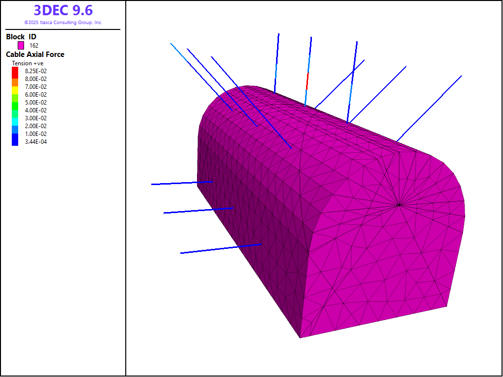 tunnel_cables.dat lists the commands to excavate the tunnel and install the cable elements. Note that we use the block excavate command rather than the block delete command so we can view the excavated region. Figure 5 shows the location of the cable elements around the excavation.