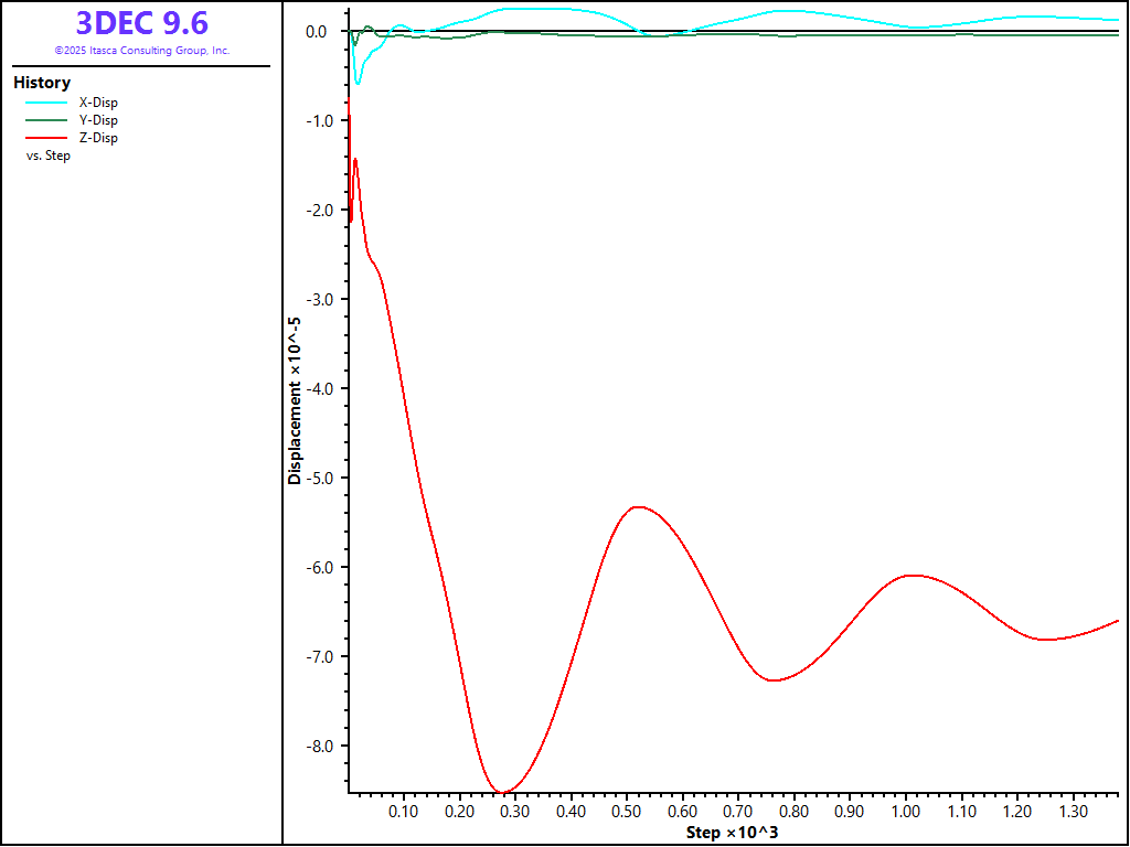 The maximum unbalanced force in the model and displacements at the top boundary are monitored to help make sure that an initial equilibrium stress state is reached. Figure 2 shows the x-, y- and z-displacement histories for the gridpoint (x = 0, y = 0, z = 10) at the top of the model.