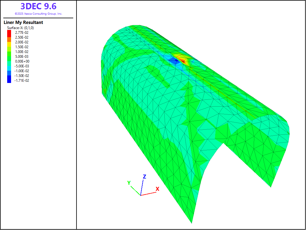 The displacement of the roof is shown in Figure 8. Roughly 1.5 mm of vertical displacement occurs when the tractions are reduced by 50%, and an additional 1.7 mm displacement after the tunnel tractions are completely removed and the liner is installed.