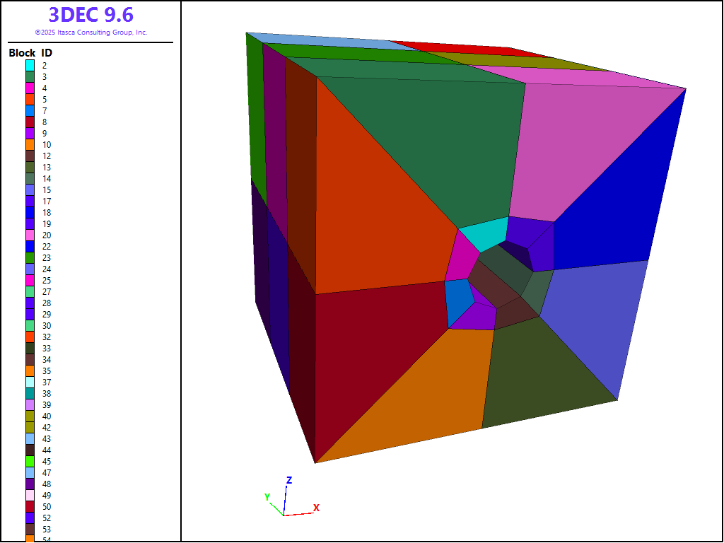 As mentioned above, there are two different starting points in building 3DEC models. The first method is to describe a simple starting shape and slice it up to create the desired geometrical features. The second involves defining complex polyhedral shapes and putting them together to form the continuous mass. Both of these approaches make use of the block create command.