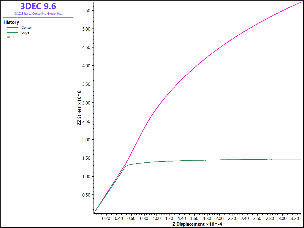 The axial (\(z\)-direction) stress-displacement response is monitored at the center and outer boundary in the grid. The results are shown in the figure below.