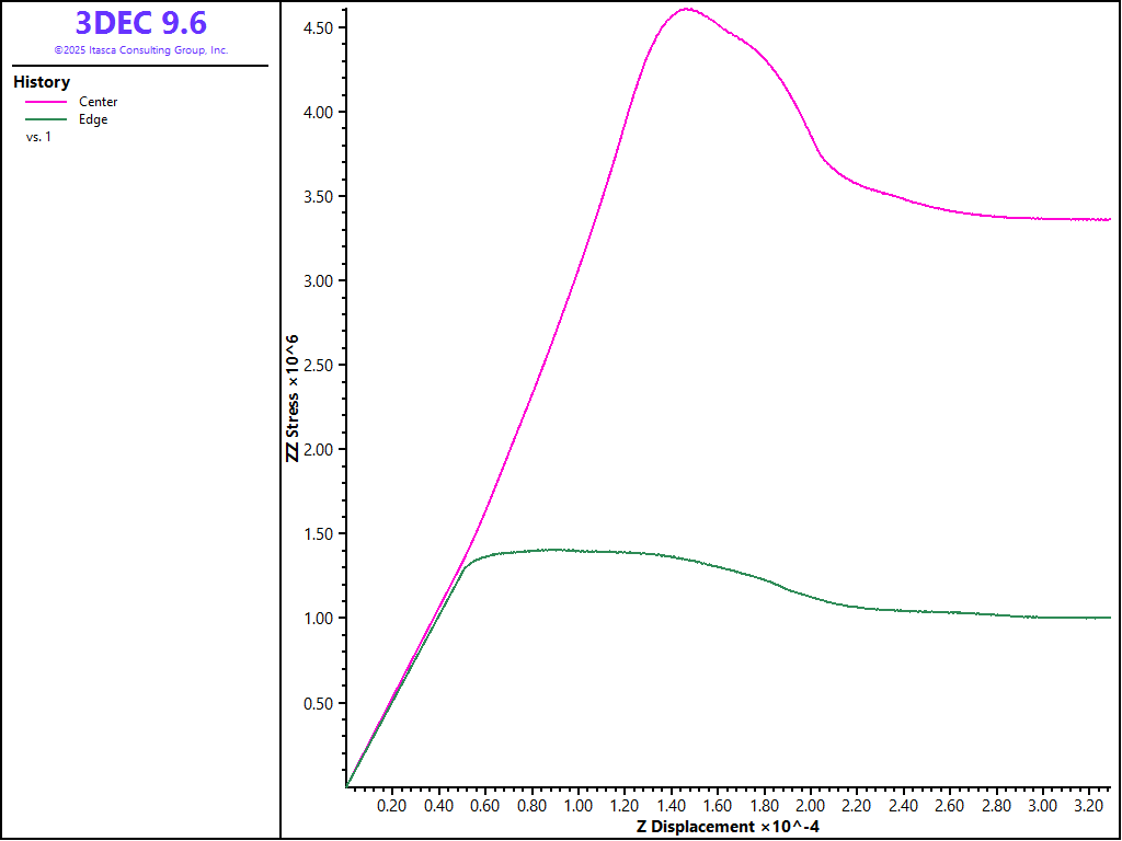 Comparison of the two images above illustrates the different responses of the two models. The initial response up to the onset of failure is identical, but post-failure behavior is quite different. Clearly, more data are required to use the strain-softening model and, typically, the softening model must be calibrated for each specific problem.