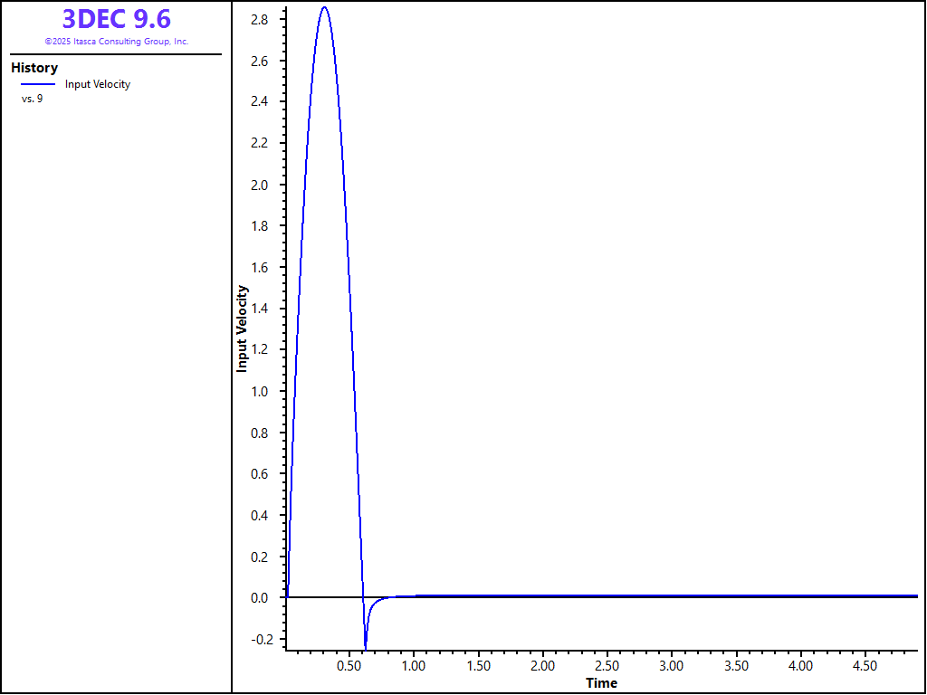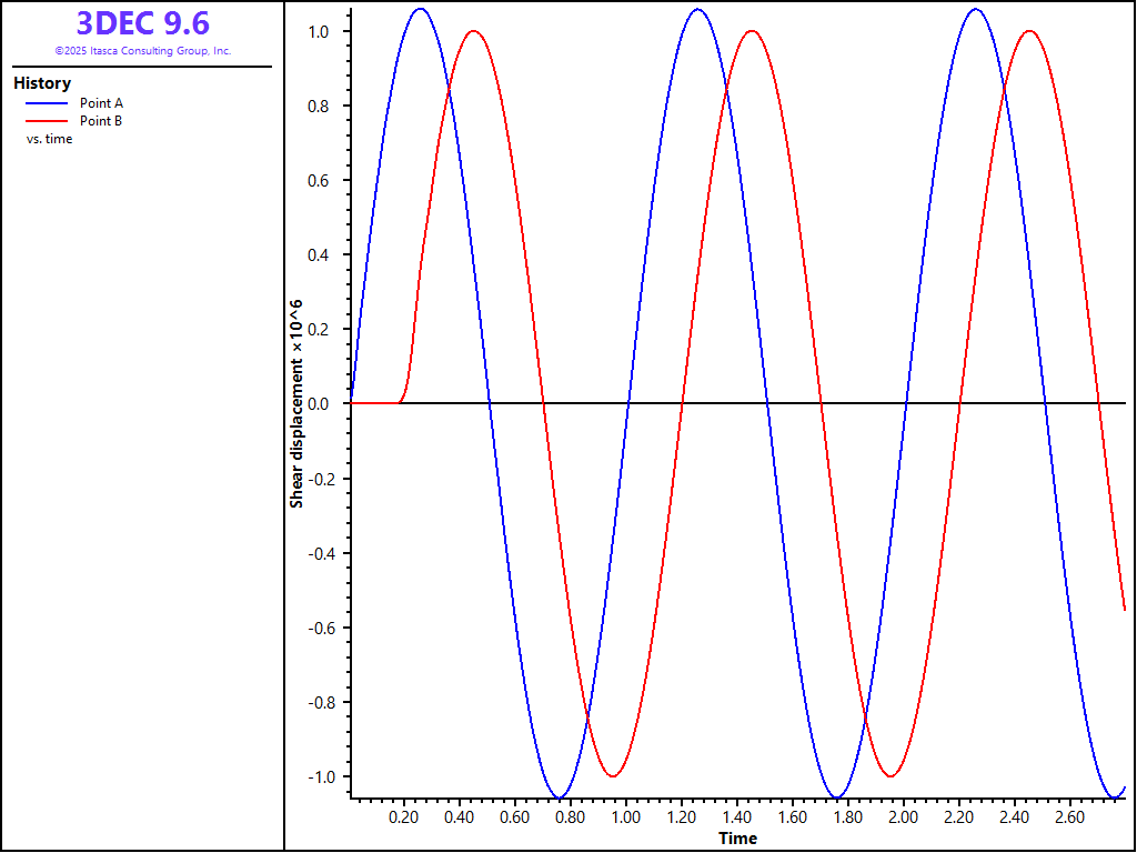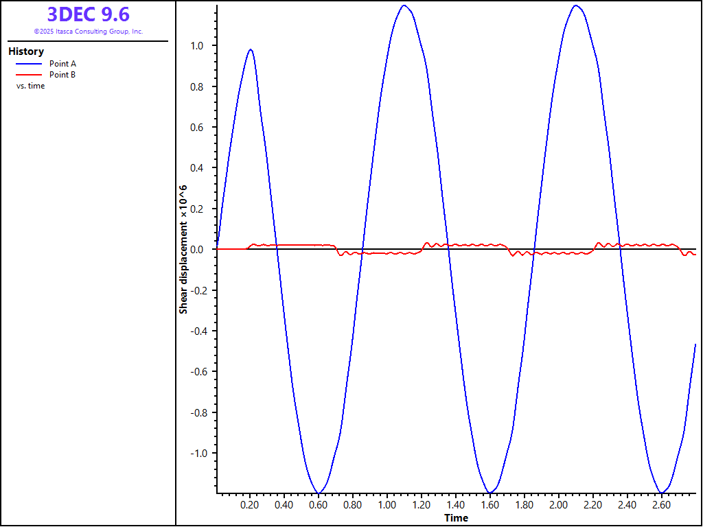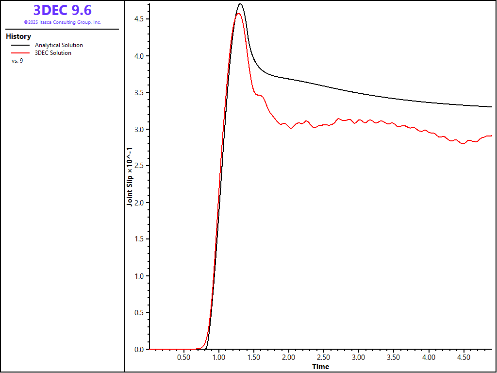 The analytical solution for wave propagation through a slipping discontinuity (Miller 1978) assumes a Mohr-Coulomb discontinuity failure criterion with constant cohesion. In 3DEC, this is accomplished by setting the residual cohesion (cohesion-residual) equal to the cohesion. By default, the cohesion drops to 0 when slip occurs. The same thing is done for tension.