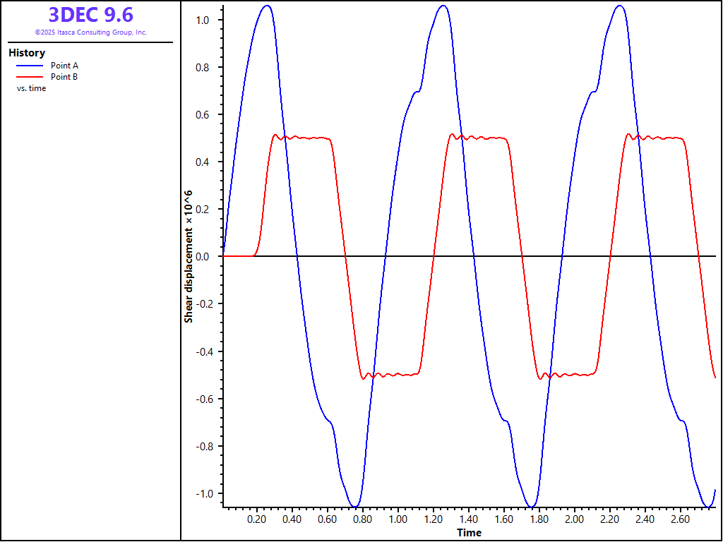 An initial run assumed that the discontinuity remains elastic by setting the discontinuity cohesion to 2.5 MPa. A stress wave of amplitude 1 MPa and frequency 1 Hz was applied at the base of the model. It should be noted that the displacements and velocities are determined at the nodal points of the tetrahedron. The stresses, however, are determined at the centroid of the tetrahedron. The time histories of shear stress, velocity and displacement are monitored at Points A (40, 15, −200) and B (40, 15, 200). The linear history of stresses are monitored close to Points A and B. The shear stresses at Points A and B are shown in Figure 4. From the amplitude of the stress history at A and B, it is clear that there was perfect transmission of the wave through the discontinuity. It is also clear from Figure 4 that the nonreflecting boundary condition provides perfect absorption of normally incident waves.
