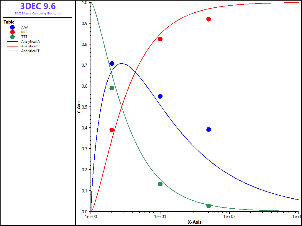 The energy flux, \(E_I\), is evaluated using Equation (2) at Point A for non-slipping discontinuities (i.e., cohesion = 2.5 MPa). \(E_T\) is evaluated at Point B for the slipping discontinuity (i.e., cohesion = 0.5, 0.1 and 0.02MPa). \(E_R\) is determined at PointB by taking the difference in velocity from the runs with slipping and non-slipping discontinuities. The coefficients of reflection (R), transmission (T ), and absorption (A) are computed using Equation (1) (see FISH function energy in file “sihsw.fis” below), and are plotted in Figure 8, along with the analytical solution (Miller 1978). The 3DEC results agree very well with the analytical solution (Figure 8).