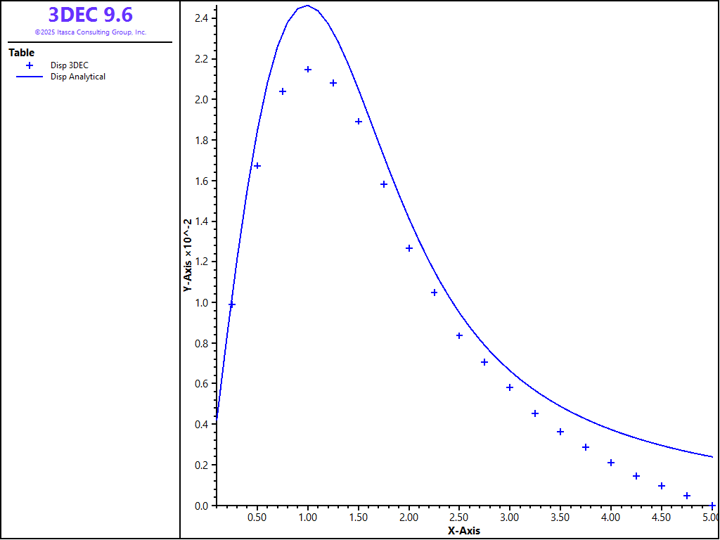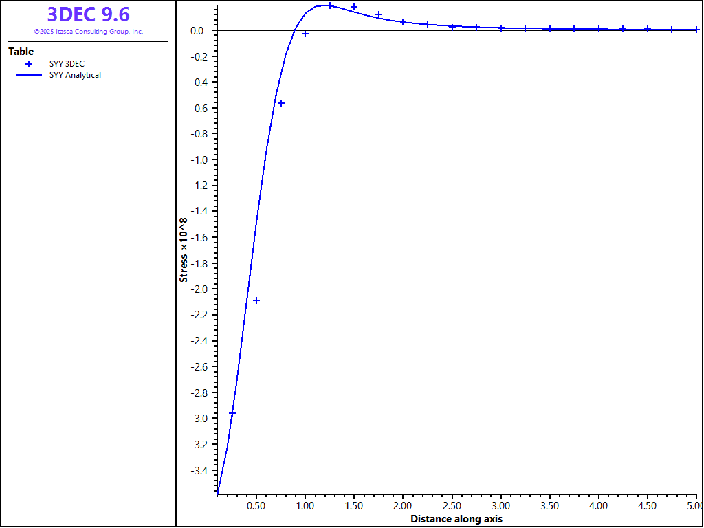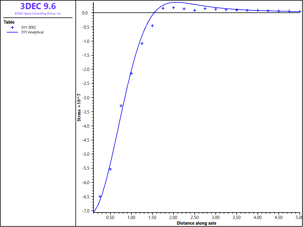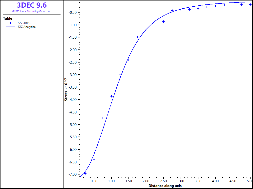 Finally, the correctness of the mechanical solution is demonstrated by comparing the stress state due to a point source with that of a point source in an infinite medium. This is a true test of the thermomechanical coupling, since the 3DEC mechanical logic is used to equilibrate the stresses. This test is particularly rigorous because the analytical solution contains a singularity at the source itself, producing steep gradients around the source.