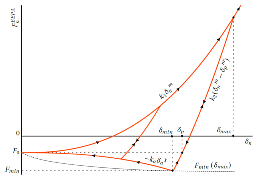 Note that the adhesion stiffness \(k_a\) is not constant, and is indirectly dependent on the load history (dependent on \(F_{min}\), which depends on the plastic overlap \(\delta_p\), which again depends on the maximum overlap \(\delta_{max}\)).