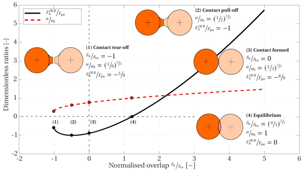 The pull-off force is independent on the elastic properties and only a function of particle size and surface adhesion energy. The contact force \(F_{n}^{JKR}\) can be normalized using \(F_{po}\) and plotted as a function of the normalized overlap \(\delta_n / \delta_{to}\), where the tear-off distance \(\delta_{to}\) is the separation distance at which the contact breaks under tension: