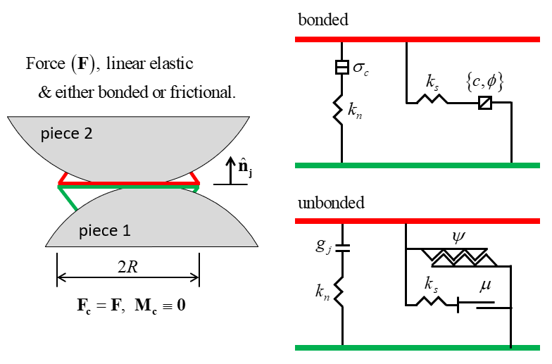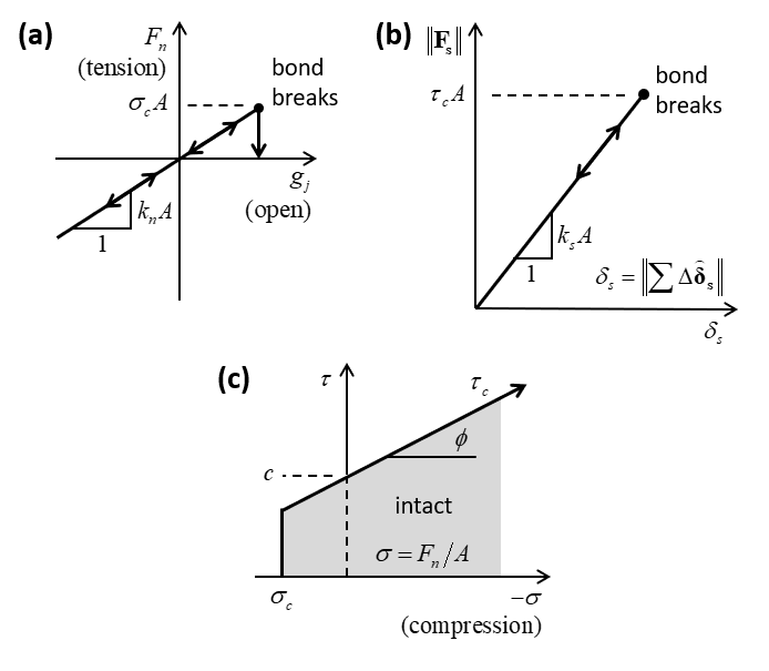 (13)\[\begin{split} S_j=\left\{\begin{array}{l} {\qquad 1,\qquad F_n \ge \sigma_c A \qquad (\rm{broken} \enspace \rm{in} \enspace \rm{tension})} \\ {\qquad 2, \qquad \left\| \mathbf{F_s}^* \right\| \ge \tau_c A \qquad (\rm{broken} \enspace \rm{in} \enspace \rm{shear})} \\ {\qquad 3, \qquad {\rm otherwise.}} \end{array}\right.\end{split}\]where \(\sigma_c\) is the bond normal strength and \(\tau_c\) is the bond shear strength (\(\tau_c = c - \left( {{F_n}} \over {{A}} \right){\rm tan} \phi\)). The following conditions are applied in each case: