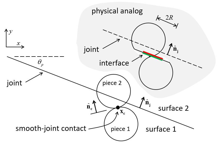 The smooth-joint model simulates the behavior of a planar interface with dilation regardless of the local particle contact orientations along the interface. The behavior of a frictional or bonded joint can be modeled by assigning smooth-joint models to all contacts between particles that lie on opposite sides of the joint.