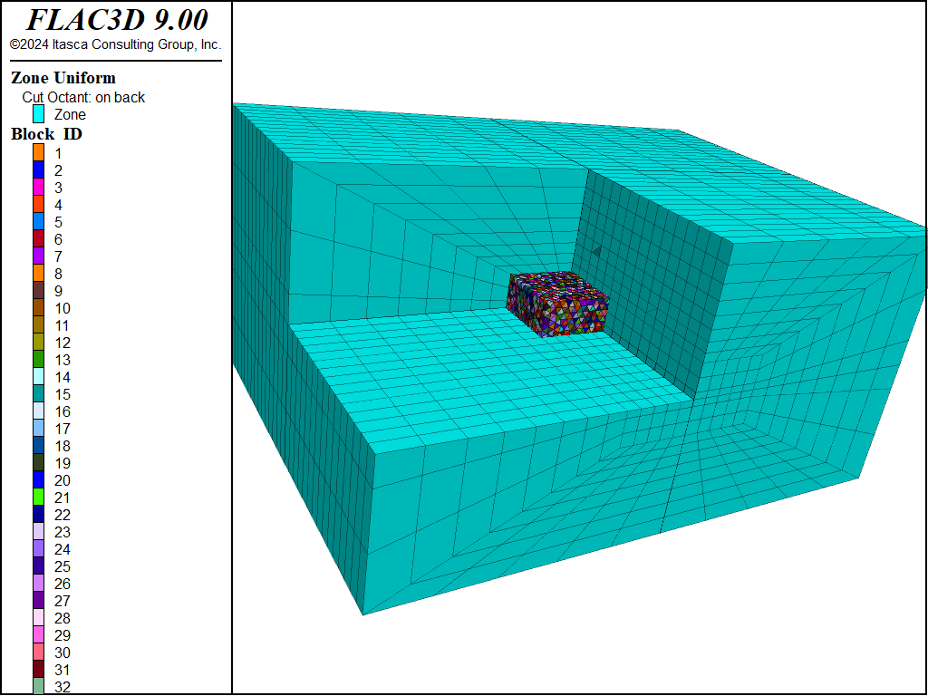 A FLAC3D model is created using Sketch. The center part is deleted and filled with 3DEC tetrahedral blocks. The model is shown in Figure 1.