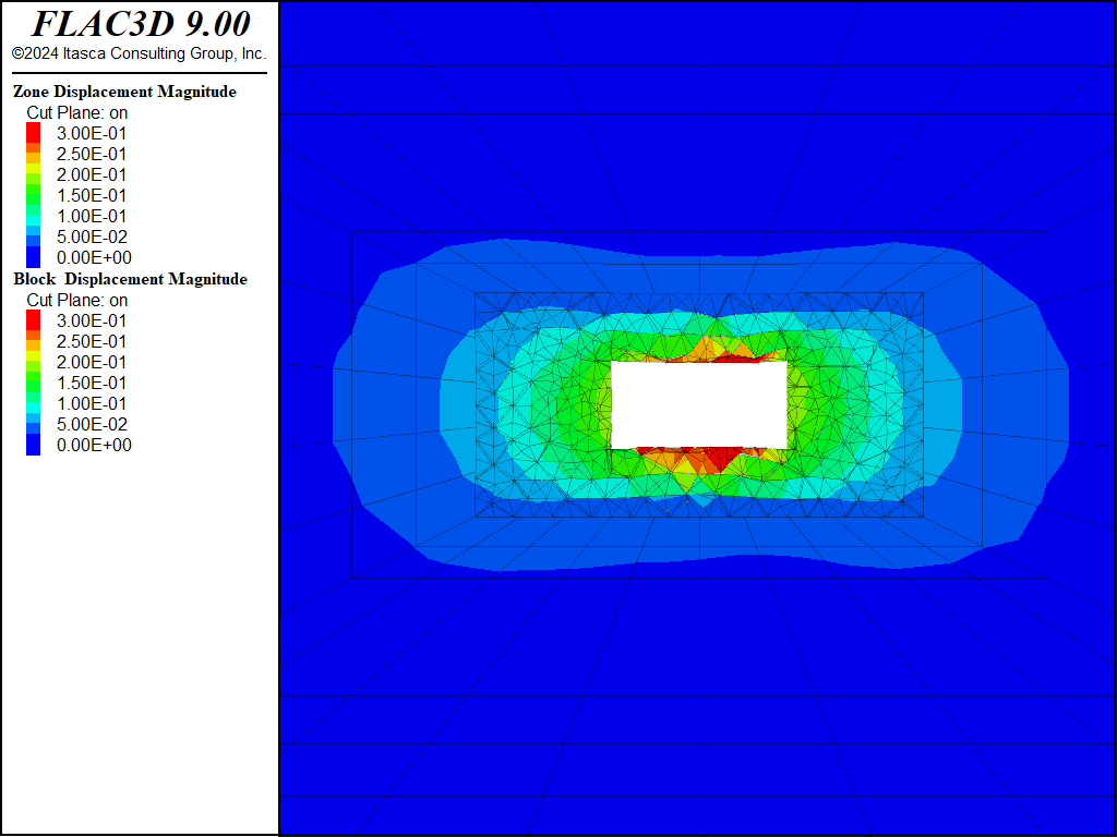 The resulting displacements are shown in Figure 3. It is clear that the displacement contours are fairly continuous across the FLAC3D-3DEC boundary indicating that the coupling is working as expected. You can also see that the FLAC3D boundary is probably too close to the 3DEC tunnel surface, possibly restricting movement of the 3DEC blocks above and below the tunnel. In a real project, the boundary would be further from the excavation and the 3DEC blocks would be smaller.