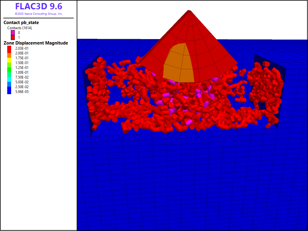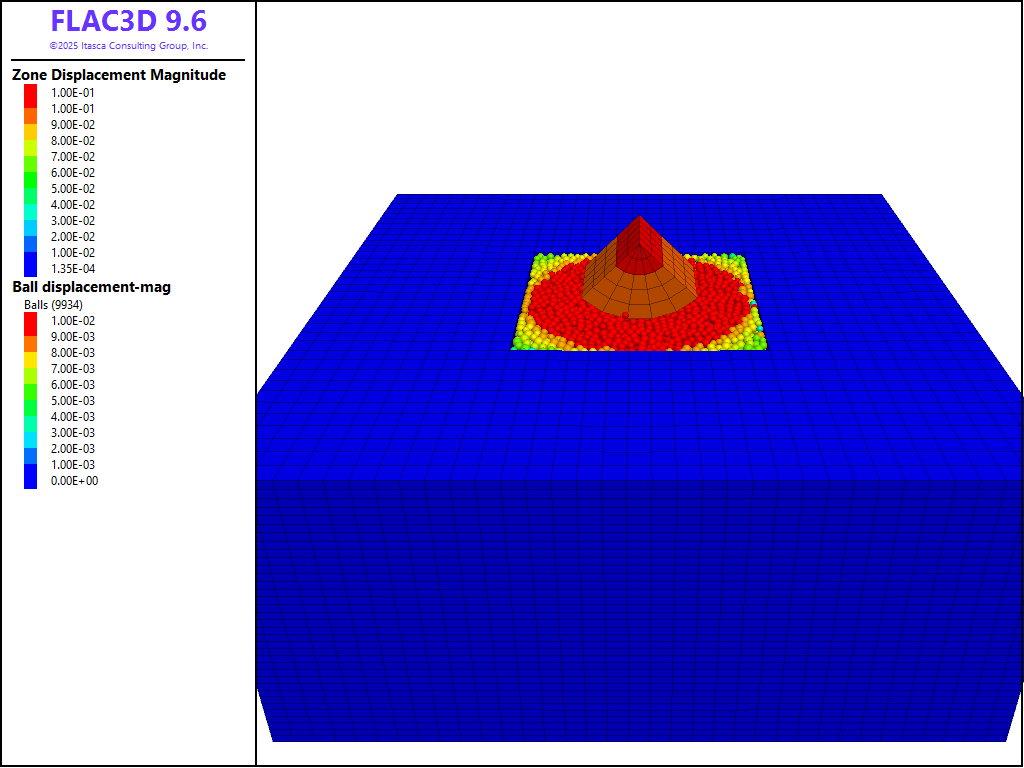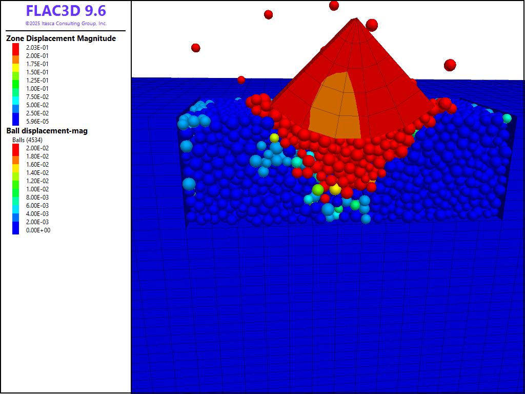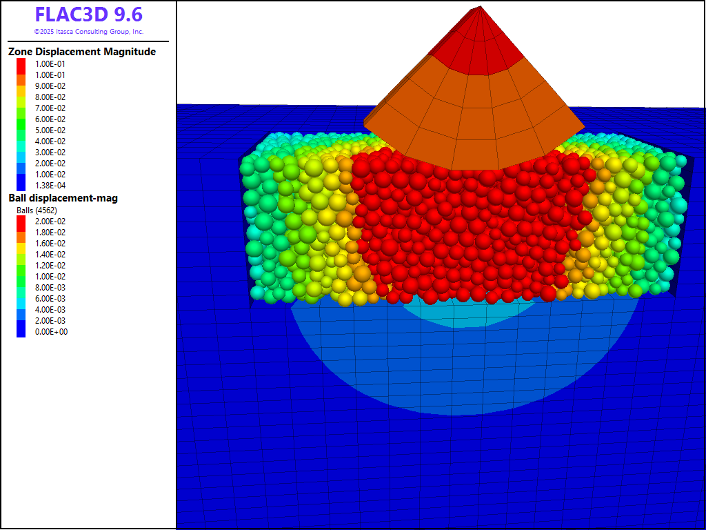 PFC balls are created within the region of nulled FLAC3D zones. In order to create the same initial cloud of balls each time the data files are run, the model random command is used to initialize the random seed to a specified value. Changing the random seed will result in a different realization of balls, though statistically, the realizations will be the same. Unlike zones and structural elements, all PFC model components (i.e., balls, clumps, walls and contacts) can only exist within a user-specified model domain (see the model domain command). This restriction allows for contact detection and spatial searching to be simplified and optimized. As PFC always operates in large-strain mode, one must explicitly activate large-strain mode for zones and structural elements (see the model large-strain command). PFC, by default, solves the dynamic equations of motion using the real inertia properties of balls and clumps. In this model, we desire to operate with timestep scaling in PFC (see the model mechanical command), an approach which is similar to the default FLAC3D behavior.