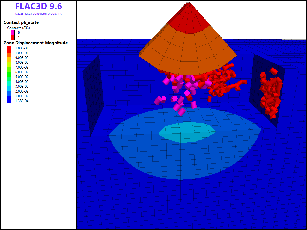 At this point in the modeling process, a stress-free BPM has been created within a cavity in a larger FLAC3D model. Some balls are bonded to the wall facets corresponding to the free zone faces. The forces/moment produced at these contacts are automatically conveyed to the associated zone gridpoints, allowing for the BPM and continuum models to naturally interact.